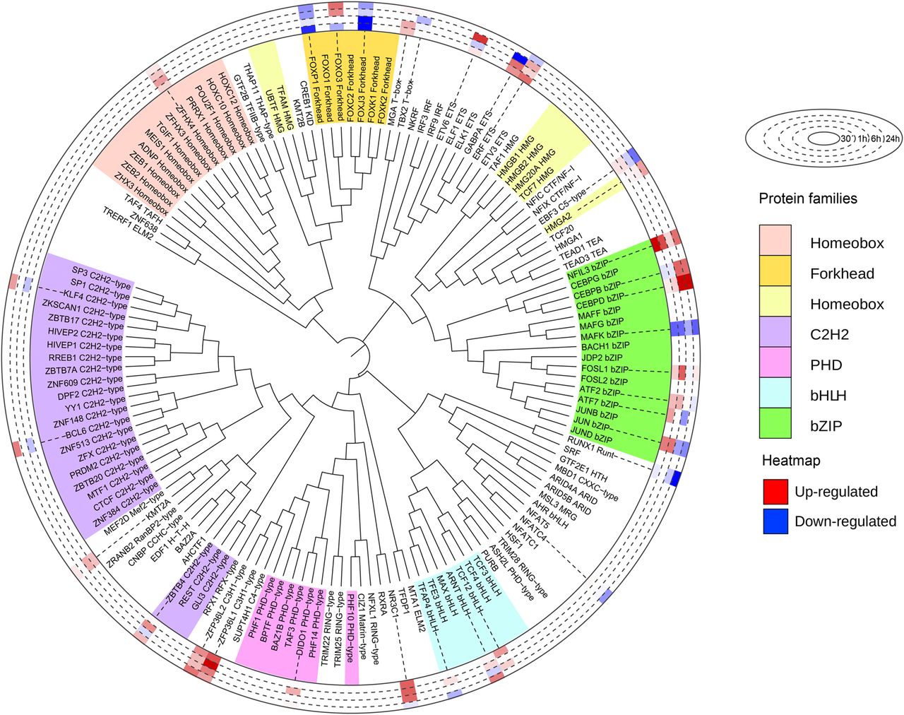 The levels of several transcription factors are altered during early osteoblast commitment. Identified and quantified transcription factors were ordered by the phylogenetic distance of their DNA-binding domains and aligned using iTOL (Letunic and Bork 2019). Histogram in the outer ring represents the regulation at protein level during induction of osteoblastic differentiation. Color codes for the different families are shown on the right.