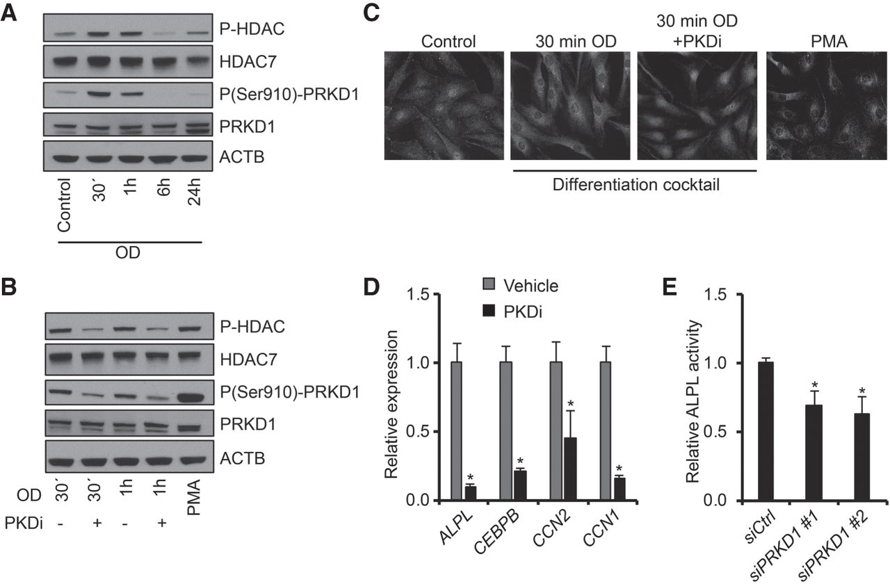 PRKD1 regulates HDAC7 localization in immortalized hMSCs. (A) Western blot images of HDAC and PRKD1 phosphorylation levels during osteoblast differentiation, n = 2. (B) Western blot of HDAC and PRKD1 phosphorylation 30 min and 1 h after induction of osteoblastic differentiation, with and without PRKD1 inhibitor (PKDi), n = 2. (C) Detection of HDAC7 in unstimulated hMSCs (Control), 30 min after osteoblastic induction (30 min OD) with and without PKDi or PMA-treated hMSCs, n = 3. (D) mRNA levels of CTGF, CEBPD, CYR61, and ALPL in relative expression 24 h after osteoblastic differentiation with and without PKDi. (E) Quantitation of alkaline phosphatase (ALPL) activity on day 6 of osteoblast differentiation of hMSC transfected with control nontargeting siRNA (siCtrl) or two independent siRNAs targeting PRKD1 (siPRKD1 #1, siPRKD1 #2). For D and E: (*) P < 0.05, Student's t-test; n = 3.