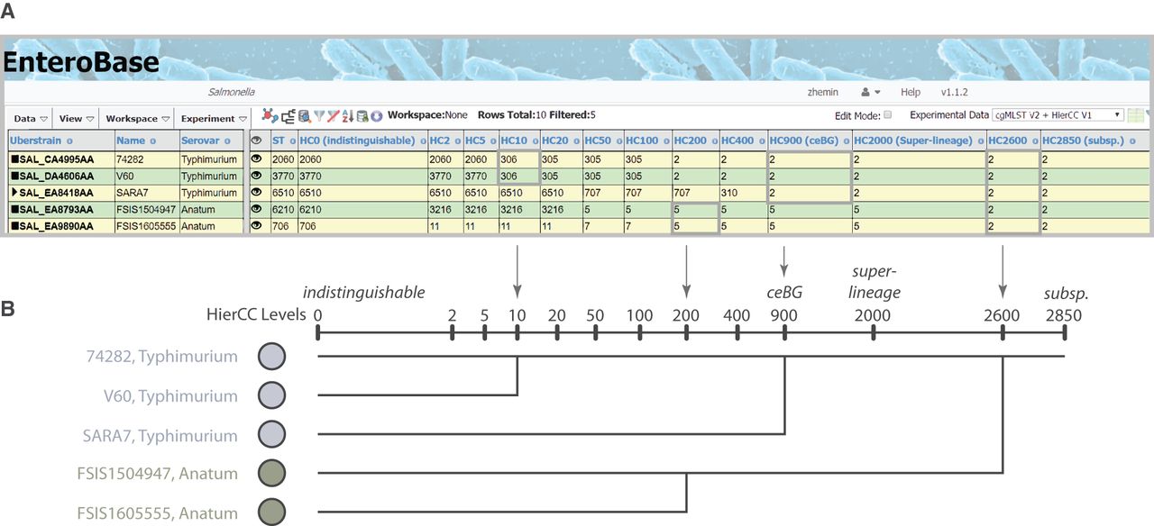 The hierarchical cgMLST clustering (HierCC) scheme in EnteroBase. (A) A screenshot of Salmonella cgMLST V2 plus HierCC V1 data for five randomly selected genomes. The numbers in the columns are the HierCC cluster numbers. Cluster numbers are the smallest cgMLST ST number in single-linkage clusters of pairs of STs that are joined by up to the specified maximum number of allelic differences. These maximum differences are indicated by the suffix of each HC column, starting with HC0 for 0 cgMLST allelic differences, other than missing data, through to HC2850 for 2850 allelic differences. The cluster assignments are greedy because individual nodes which are equidistant from multiple clusters are assigned to the cluster with the smallest cluster number. (B) Interpretation of HierCC numbers. The assignments of genomic cgMLST STs to HC levels can be used to assess their genomic relatedness. The top two genomes are both assigned to HC10_306, which indicates a very close relationship, and may represent a transmission chain. The top three genomes are all assigned to HC900_2, which corresponds to a legacy MLST eBG. HC2000 marks superlineages (Zhou et al. 2018c), and HC2850 marks subspecies. This figure illustrates these interpretations in the form of a cladogram drawn by hand.