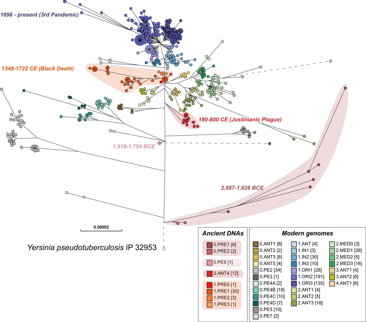 Maximum-likelihood tree of modern and ancient genomes of Y. pestis. EnteroBase contained 1368 ancient and modern Y. pestis genomes in October 2019, of which several hundred genomes that had been isolated in Madagascar and Brazil over short time periods showed very low levels of genomic diversity. To reduce this sample bias, the data set used for analysis included only one random representative from each HC0 group from those two countries, leaving a total of 622 modern Y. pestis genomes. Fifty-six ancient genomes of Y. pestis from existing publications were assembled with EToKi (Methods), resulting in a total of 678 Y. pestis genomes plus Yersinia pseudotuberculosis IP32953 as an outgroup (http://enterobase.warwick.ac.uk/a/21975). The EnteroBase pipelines (Supplemental Fig. S2D) were used to create a SNP project in which all genomes were aligned against CO92 (2001) using LASTAL. The SNP project identified 23,134 nonrepetitive SNPs plus 7534 short inserts/deletions over 3.8 Mbps of core genomic sites which had been called in ≥95% of the genomes. In this figure, nodes are color coded by population designations for Y. pestis according to published sources (Morelli et al. 2010; Cui et al. 2013; Achtman 2016), except for 0.PE8 which was assigned to a genome from 1918 to 1754 BCE (Spyrou et al. 2018). The designation 0.ANT4 was applied by Achtman (2016) to Y. pestis from the Justinianic plague described by Wagner et al. (2014), and that designation was also used for a genome associated with the Justinianic plague (DA101) that was later described by Damgaard et al. (2018) as 0.PE5.