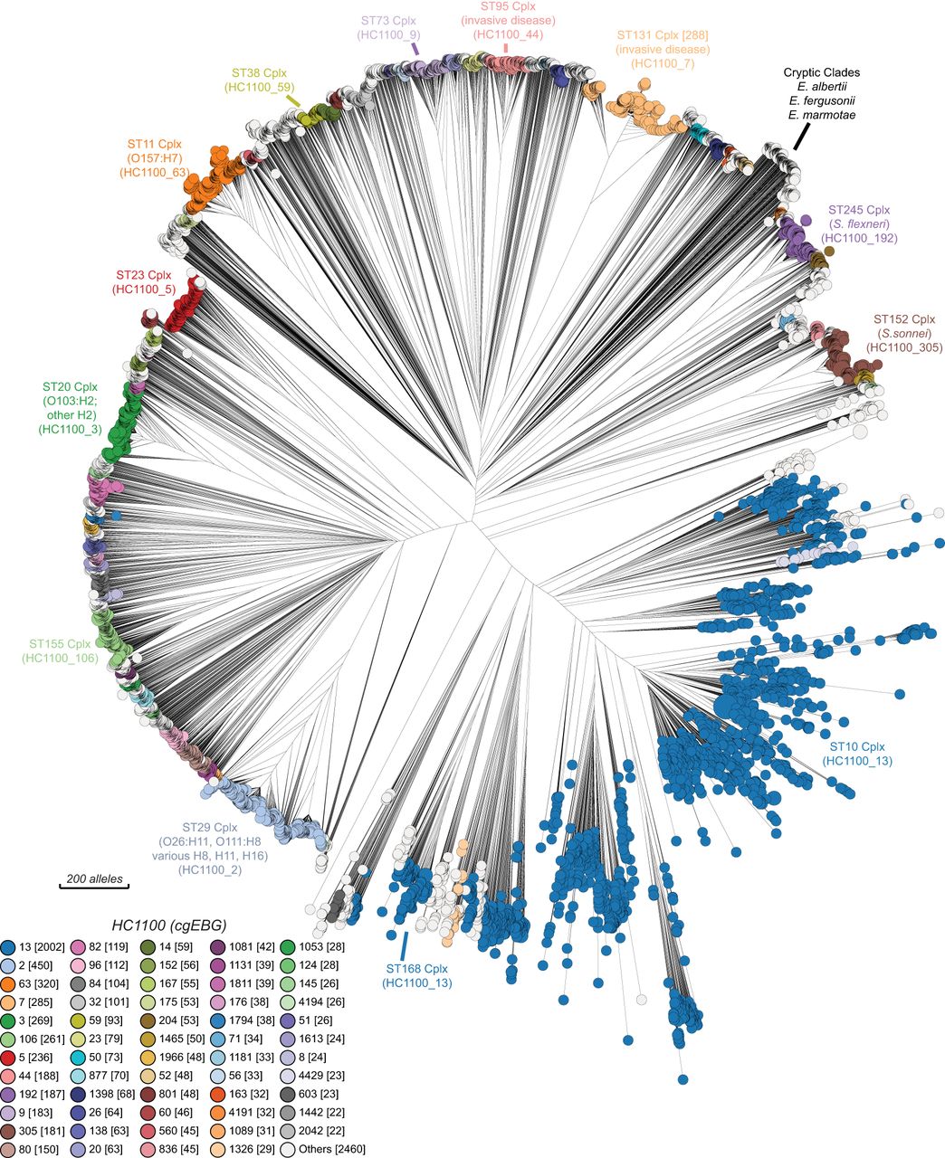 Neighbor-joining (RapidNJ) tree of core genome allelic distances in the EcoRPlus Collection of 9479 genomes. EcoRPlus includes the draft genome with the greatest N50 value from each of the 9479 rSTs among 52,876 genomes of Escherichia within EnteroBase (August 2018) (http://enterobase.warwick.ac.uk/a/15931). The nodes in this tree are color coded by HC1100 clusters, as indicated in the key at the bottom left. Common HC1100 clusters (plus the corresponding ST Complexes) are indicated at the circumference of the tree. These are largely congruent, except that HC1100_13 corresponds to ST10 Complex plus ST168 Complex, and other discrepancies exist among the smaller, unlabeled populations. See Supplemental Figures S7, S8, respectively, for color coding by ST Complex and Clermont typing. An interactive version in which the nodes can be freely color coded by all available metadata is available at http://enterobase.warwick.ac.uk/a/15981. A maximum-likelihood tree based on SNP differences can be found in Supplemental Figure S9.