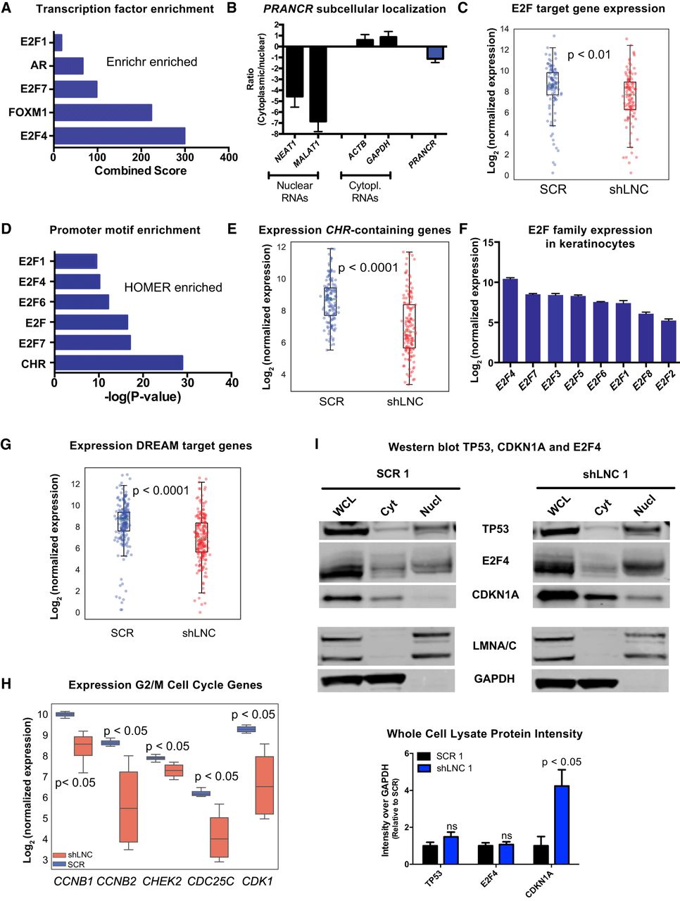 PRANCR regulates expression of cell cycle genes containing the CHR promoter element. (A) Combined score of transcription factor enrichment of genes down-regulated upon PRANCR depletion using Enrichr gene set enrichment analysis. (B) PRANCR mRNA expression in cytoplasmic and nuclear cell fractions, measured by qRT-PCR, compared with known cytoplasmic (ACTB and GAPDH) and nuclear RNAs (NEAT1 and MALAT1). Bars, mean with SEM; n = 4 cell lines. (C) Normalized expression of E2F target genes. For box plots, dots represent mean expression level (n = 4) of each gene, lines represent median values of the gene set, box limits denote interquartile range, and whiskers extend 1.5 times the interquartile range. Differences evaluated with Student's t-test. (D) Motif enrichment of down-regulated DEGs using HOMER. (E) Normalized expression of genes containing a CHR promoter element. (F) Normalized expression of E2F family members in primary keratinocytes (n = 4; mean with SD). (G) Normalized expression of DREAM target genes. (H) Normalized expression of G2/M genes. (I) Western blot of TP53, E2F4, and CDKN1A in whole-cell lysate, cytoplasmic (Cyt), and nuclear (Nucl) fractions in control (SCR) and PRANCR-depleted cells (shLNC1). LMNA/C (nuclear) and GAPDH (cytoplasmic) represent experimental fractionation controls. Lower panel shows quantification of results by densitometry after normalization of total protein levels and represents the average of three biological replicates (Supplemental Fig. S6). Results evaluated with paired Student's t-test.