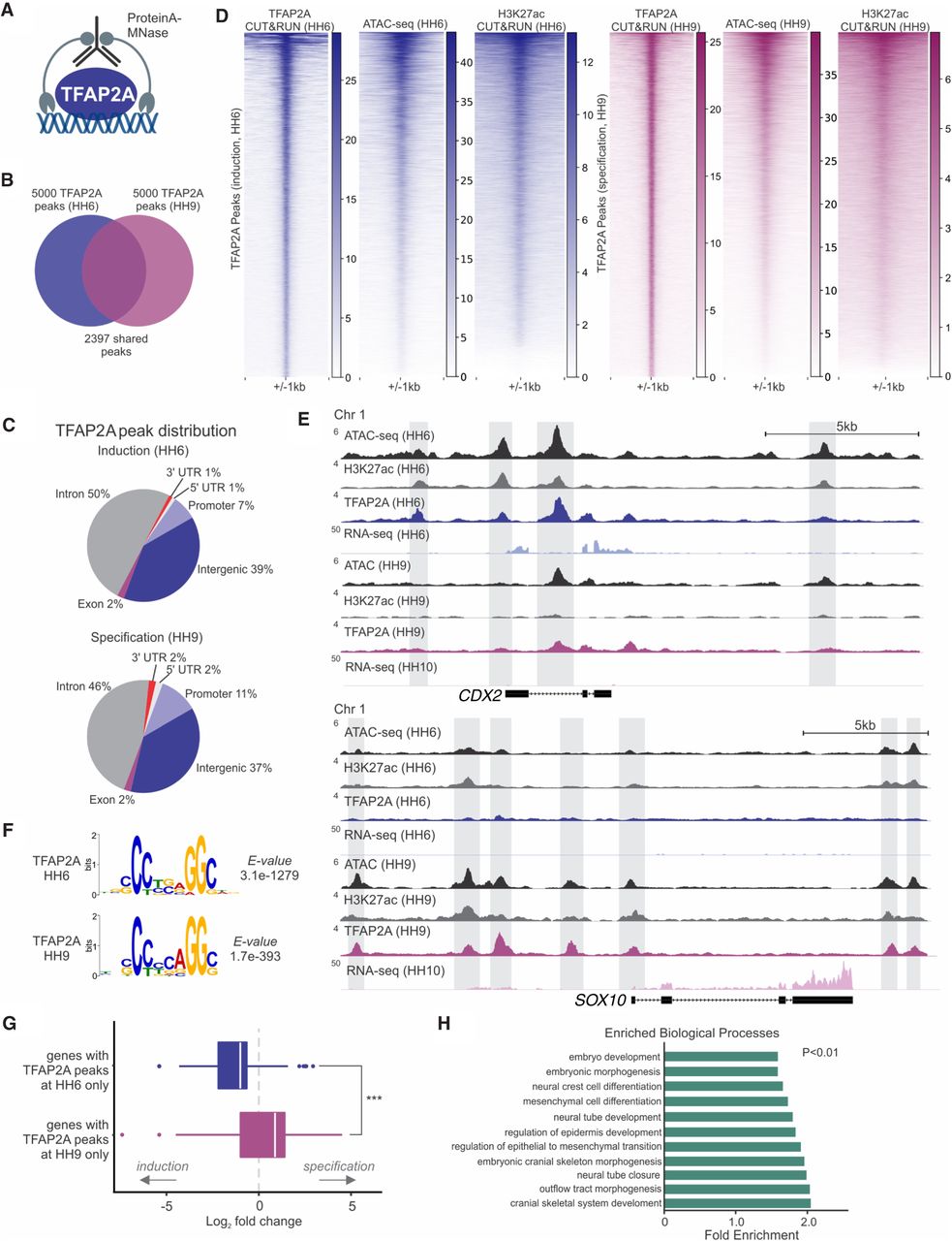TFAP2A is associated with distinct sets of cis-regulatory elements at sequential steps of neural crest formation. (A) CUT&RUN was used to assess global binding by TFAP2A during induction (HH6) and specification (HH9) in developing chick embryos. (B) Venn diagram of the top 5000 significantly enriched TFAP2A peaks present during induction and specification, 2397 of which are maintained between both developmental time points. (C) Pie charts depicting genomic distribution of TFAP2A peaks at induction (HH6) and specification (HH9). (D) Heatmaps displaying TFAP2A CUT&RUN, ATAC-seq, and H3K27ac CUT&RUN signal at TFAP2A peaks during induction (HH6) and specification (HH9). (E) ATAC, CUT&RUN, and RNA-seq profiles at the loci of the induction gene CDX2 and specification gene SOX10. (F) De novo motif enrichment analysis via MEME-ChIP shows a strong enrichment for the TFAP2A binding motif from both HH6 and HH9 CUT&RUN data sets. Values indicate significance of motif occurrence as reported by MEME. (G) Boxplot displaying the log2 fold change distribution of differentially expressed genes (Padj < 0.1) between HH6 and HH10, which are associated with TFAP2a binding. Genes with HH6-only peaks are enriched during induction, whereas genes with HH9-only peaks are enriched during specification. Significance was assessed via an unpaired two-tailed t-test. (H) Bar plot showing significantly enriched Gene Ontology (GO) terms from GO analysis of genes with annotated TFAP2A peaks (see also Supplemental Table S3). (HH) Hamburger Hamilton; (kb) kilobase. (***) P ≤ 0.001.