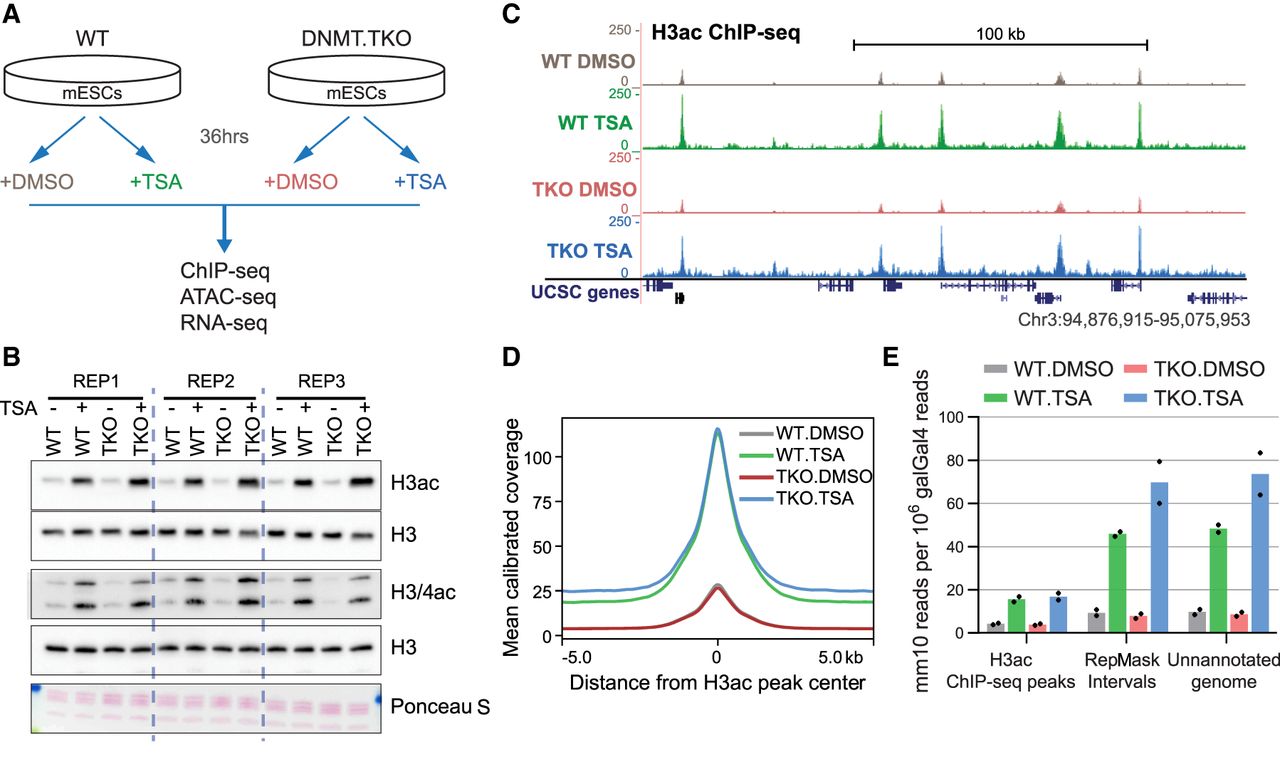 Disruption of HDAC activity and DNA methylation in mouse embryonic stem cells. (A) Schematic of the experimental approach used in this study. (B) Immunoblot analysis of global histone H3 and H4 acetylation levels after 36-h TSA treatment in mESCs. Samples were derived from three biological replicate experiments. (C) Representative snapshot of genomic region showing H3ac ChIP-seq read coverage calibrated to the spike-in galGal4 genome. (D) Metaplot showing the average calibrated H3ac ChIP-seq signal from DMSO- or TSA-treated wild-type and DNMT.TKO cells in 10-kb regions surrounding the center of ChIP-seq peaks (n = 28608). (E) Distribution of H3ac ChIP-seq reads within genomic intervals separated into three mutually exclusive categories. For every sample, the number of mm10 reads overlapping each category was divided by the total number of reads mapping to the galGal4 genome. Data are represented as the mean; points indicate the values for two biological replicates.