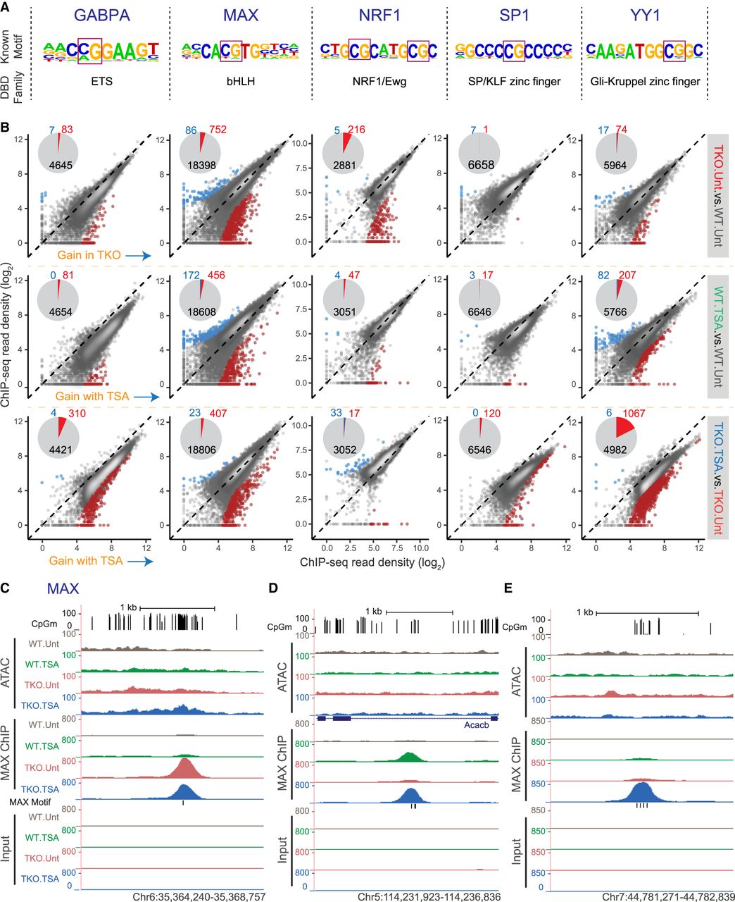 DNA methylation and HDAC activity can modulate transcription factor occupancy. (A) For each transcription factor, the position weight matrix (PWM) of its known motif and its DNA-binding domain (DBD) type are shown. (B) Pairwise comparisons of normalized GABPA, MAX, NRF1, SP1, or YY1 ChIP-seq signal for all identified occupancy peaks. Regions with significantly differential occupancy are colored on the scatterplots, and their numbers are summarized in the form of pie charts (light blue = significant decrease; red = significant increase). ChIP-seq signal from three biological replicate samples was averaged. (C–E) Representative UCSC Genome Browser snapshots showing CpG methylation levels, ATAC-seq, MAX ChIP-seq, and Input ChIP-seq read coverage.