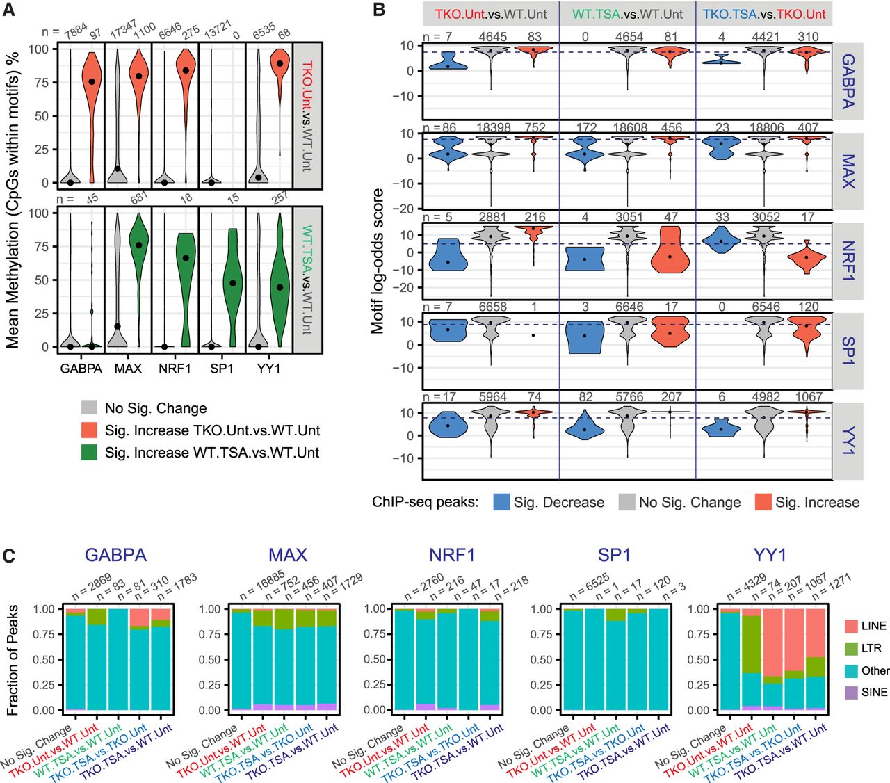 Characteristics of transcription factor (TF) binding sites. (A) Distribution of CpG methylation levels within the TF motifs that underlie ChIP-seq peaks. For each TF, we isolated all sequences that were located within peak regions that matched the relevant position weight matrix and determined the methylation status of the CpG nucleotides. CpG sites are grouped according to their differential occupancy. Black dots indicate the median. (B) Distribution of maximum log-odds scores found at different subsets of ChIP-seq peaks. Within each interval of the GABPA, MAX, NRF1, SP1, and YY1 peak-sets, the sequence most similar to the respective PWM was identified and its log-odds score, indicative of the deviation from the consensus sequence, was plotted. Black dots indicate the median. The dashed lines indicate the log-odds score threshold above which a sequence is said to match the PWM. (C) Fraction of ChIP-seq peaks that overlap an annotated transposable element. ChIP-seq peaks are classified based on their differential occupancy.