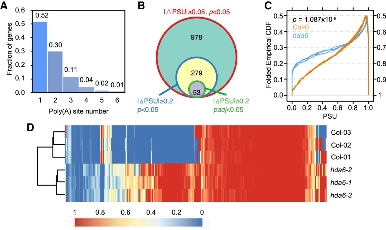 Mutation of HDA6 affects mRNA polyadenylation. (A) Fraction of genes with different number of poly(A) sites. (B) Venn diagram of identified APA genes by different threshold values. A total of 10,681 genes with at least two poly(A) sites were used for selections. PSU indicates the frequency of poly(A) site usage. (C) Folded cumulative distribution frequency (CDF) of PSUs of Col-0 and hda6. Only poly(A) sites with padj < 0.05 were selected for plotting. Three replicates were plotted separately. The y-axis indicates the fraction of poly(A) sites. (D) Heat map of PSUs of Col-0 and hda6. Only poly(A) sites with padj < 0.05 were selected for plotting. The scale bar is on the bottom.