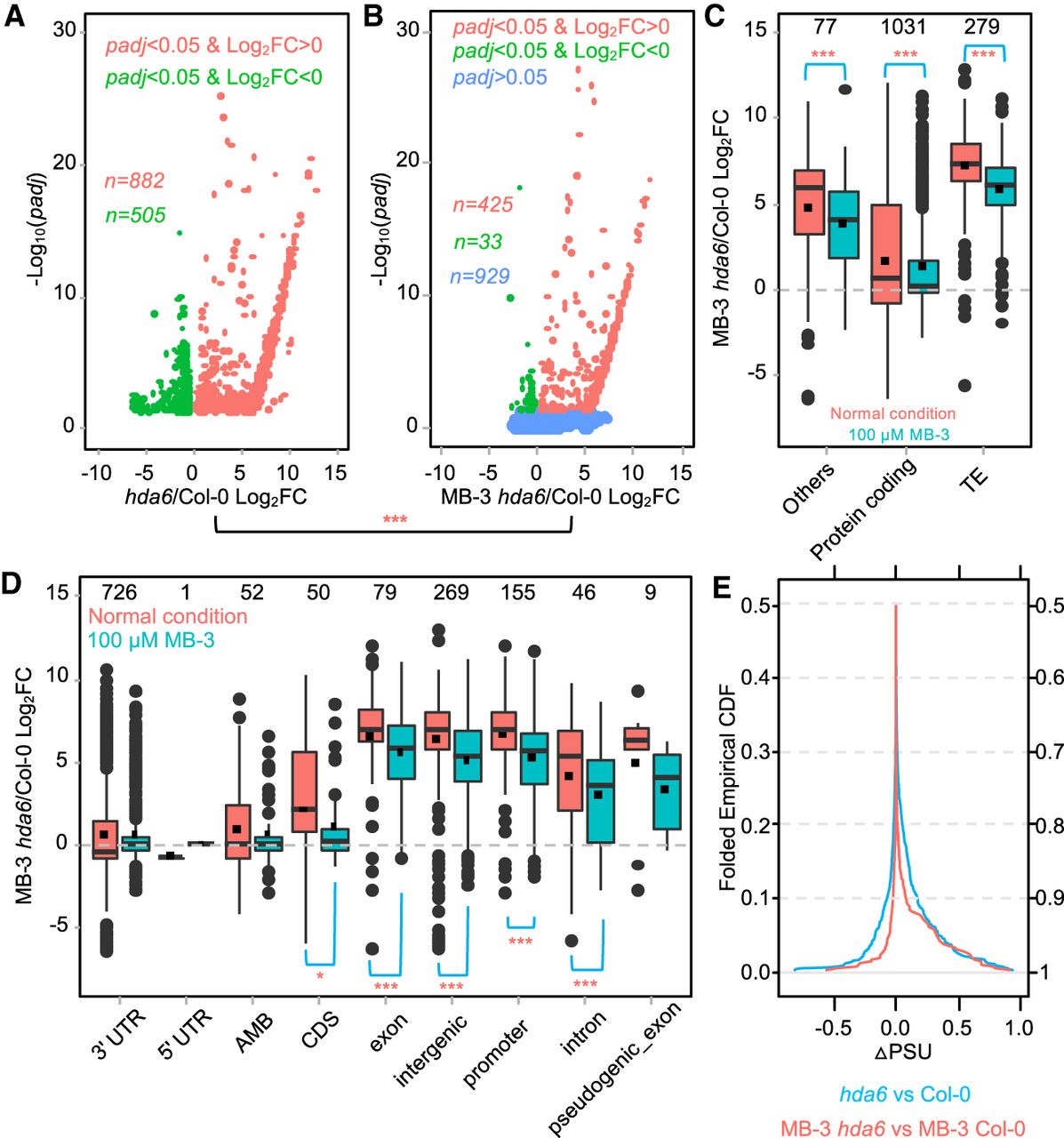 The histone acetyltransferase inhibitor partially restored the effect of hda6 on polyadenylation. DE poly(A) sites (padj < 0.05) between hda6 and Col-0 are used for plotting. (***) Wilcoxon signed-rank test P < 0.001; (*) P < 0.05, when compared to nontreated groups. (A) More poly(A) transcripts are up-regulated in hda6. Log2FC indicates log2 of fold change of gene expression level. (B) MB-3 treatment minimizes the DE counts between hda6 and Col-0. (C,D) Distribution of DE poly(A) sites. Counts of poly(A) sites in each category are shown on the top of boxes. (TE) Transposon elements, (AMB) ambiguous regions which have overlapped features. Lines and dots in the boxes indicate the medians and means, respectively. (E) MB-3 treatment reduces the difference of PSUs between hda6 and Col-0. ΔPSU represents the difference of PSU of a poly(A) site in hda6 and Col-0.