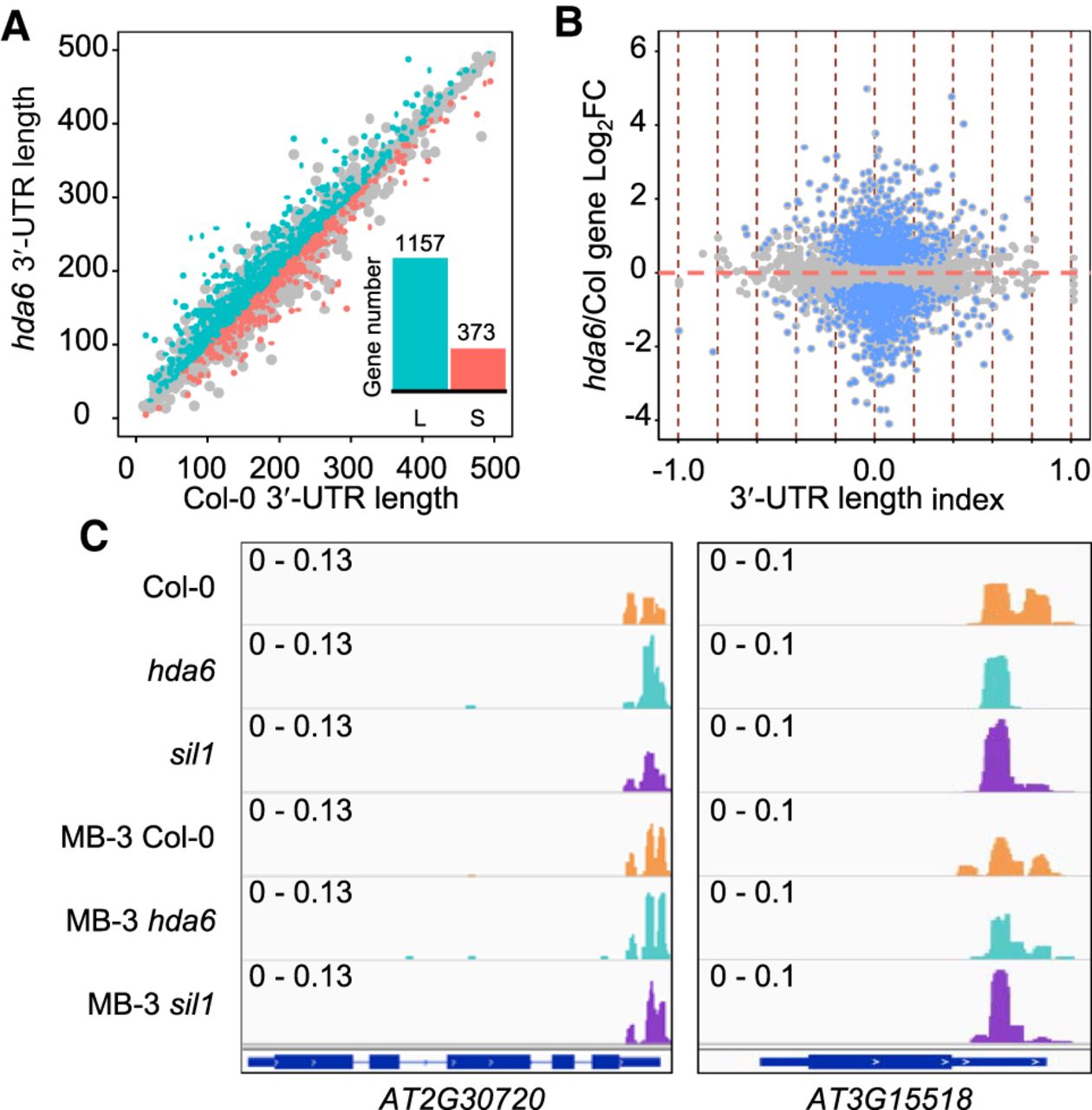 3′-UTR length variation is independent of gene expression activity in hda6. (A) Scatter-plot of weighted 3′-UTR lengths of hda6 and Col-0. (L) 3′-UTR lengthening event, (S) 3′ UTR shortening event. (B) Effect of HDA6 on 3′-UTR length and gene expression are independent. Blue dots indicate DE genes (padj < 0.05) identified from RNA-seq profiles; red vertical dashed lines indicate 0.2 intervals of 3′-UTR length index (>0, lengthening; <0, shortening). (C) Examples of a 3′ UTR lengthening event (left panel) and a 3′ UTR shortening event (right panel), respectively. Scale of each sample is indicated by data range.