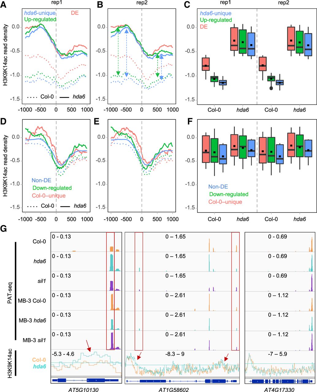 H3K9K14ac profiles across the poly(A) sites. (A–C) H3K9K14ac profiles around DE, up-regulated, and hda6-unique poly(A) sites, respectively. (D–F) H3K9K14ac profiles around non-DE, down-regulated, and Col-0–unique poly(A) sites, respectively. (G) H3K9K14ac and APA of AT5G10130, AT1G58620 (RPP7), and non-DE poly(A) sites gene AT4G17330. Red arrows indicate H3K9K14ac is higher in hda6 than Col-0. Red rectangles indicate the potential DE poly(A) sites affected by deacetylation abortion.