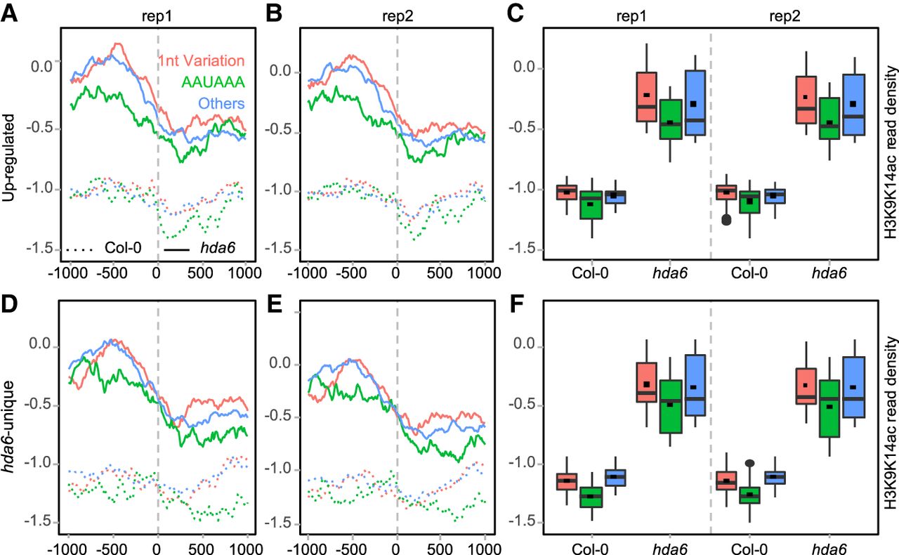 Different poly(A) signals are associated with different H3K9K14ac profiles. The Wilcoxon signed-rank test was used to evaluate the statistical significance of the acetylation level differences, and P values are listed in Supplemental Table S7. (A–C) Up-regulated poly(A) sites. (D–F) hda6-unique poly(A) sites.
