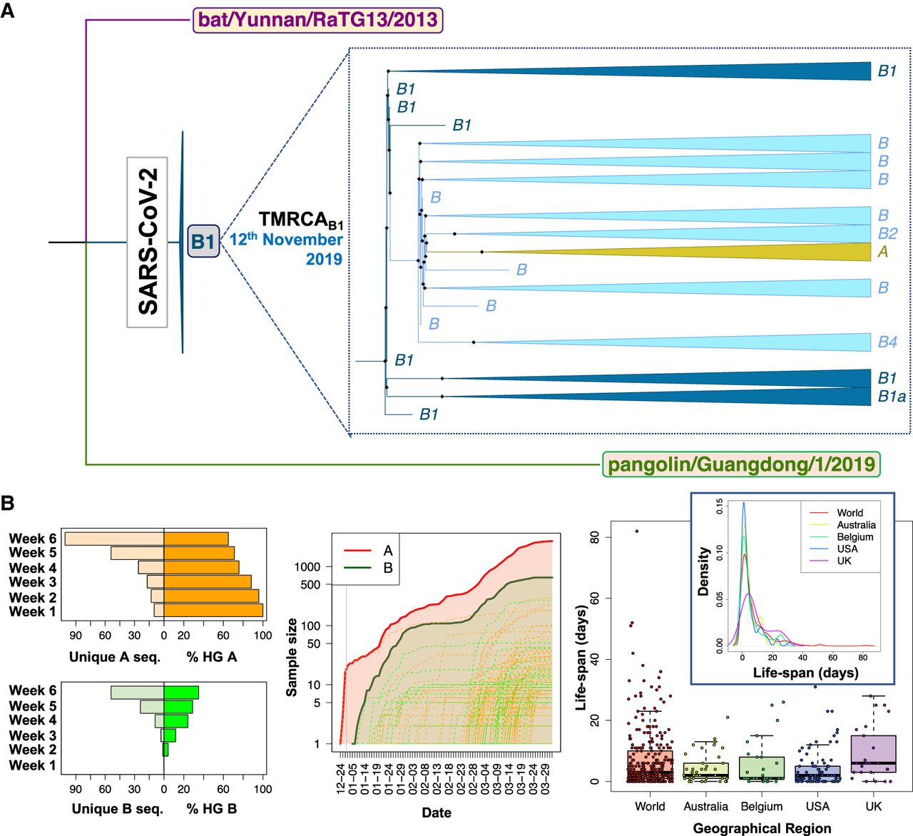 Contrasting evidence supporting different roots for SARS-CoV-2 genomes. (A) Interspecific ML tree using genomes sampled in GISAID before March 2020, indicating the root in haplogroup B1 for all existing SARS-CoV-2 genomes. (B, left) The histograms on the right represent the number of unique haplotypes belonging to haplogroups A and B accumulated during the first 6 wk of the pandemic, whereas the histograms on the left show the evolution of the frequencies of haplogroups A and B in the same period (note that A and B frequencies are complementary); (middle) growth of sample size of the main A branch (red solid line) and A sub-branches (red dashed lines) and the main B branch (green solid line) and B sub-branches (green dashed lines), indicating that B and derivative clades appear at a later moment of the pandemic than A and its subclades. The gray vertical line separates year 2019 from year 2020; (right) boxplot and density function of the life-span period of identical haplotypes in the database (as a proxy for the life-span period of a SARS-CoV-2 genome) worldwide and in various countries (by way of example, we only included those data sets having high sample sizes).