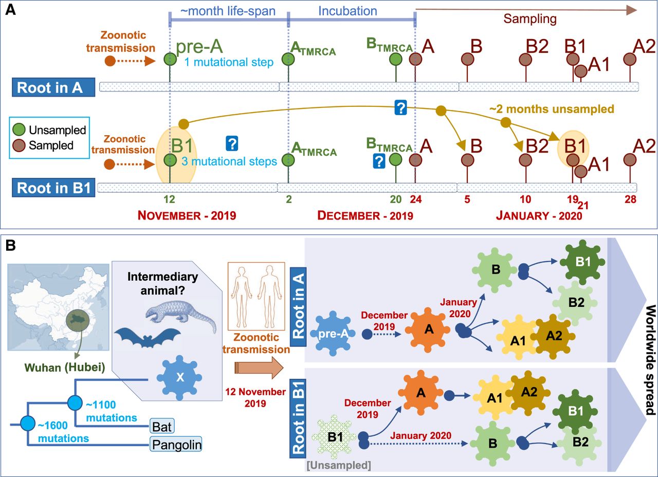 Scheme explaining two alternative models for the location of the root of the SARS-CoV-2 genomes according to their chronologies. (A) Locating the root in haplogroup A would be consistent with a logical evolutionary time line that accounts for the number of mutations accumulated from an alleged pre-A ancestor originating from a zoonotic transmission between an intermediary animal and humans (occurring ∼November 12, 2019) and also consistent with TMRCA values estimated for Chinese A, B, B1, and B2 haplotypes (see text). The alternative of considering B1 as the root would enter into conflict (represented by a question mark) with mutation rates of SARS-CoV-2 genomes, coupled with the large unsampled period needed to explain the hypothetical first appearance of B1 on approximately November 12, 2019 and its first sampling on January 19, 2020, as well as TMRCA for haplogroups A, B, B1, and B2 (see text). (B) The scheme summarizes the two alternative evolutionary scenarios assuming roots in haplogroup A or B1, according to the time lines outlined in the upper panel.
