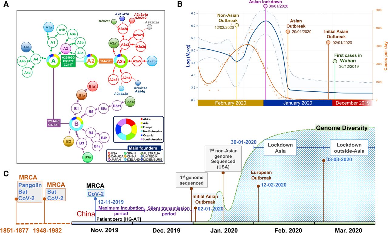 Phylogenetic and phylodynamics of SARS-CoV-2, and timeline of the pandemic. (A) Simplified SARS-CoV-2 phylogeny (schematic version of Fig. 3) illustrating the main worldwide branches and the haplogroups responsible for the main outbreaks (founders favored by super-spreading) occurring in Asia and outside Asia (colored filled circles). The overall distribution color keys refer only to pie charts, and the main founder color keys refer only to filled circles. (B) EBSP based on genomes sampled from the beginning of the pandemic until the end of February 2020 (n = 621). The orange distribution shows the real number of cases per day as recorded in https://ourworldindata.org for the same time period (we disregarded the abnormal peak occurring on February 13, 2020, because more than 15,000 new cases were reported in China in just 1 d, most likely representing unconfirmed cases). (C) Time line of the main events occurring during the pandemic, and indicating the MRCA of all SARS-CoV-2 genomes; the dotted area is a schematic representation of the real diversity values reported in Supplemental Figure S10 and Supplemental Table S3. Divergence dates between SARS-CoV-2 and bat sarbecoronavirus reservoir and between bat and pangolin coronaviruses were taken from Boni et al. (2020).