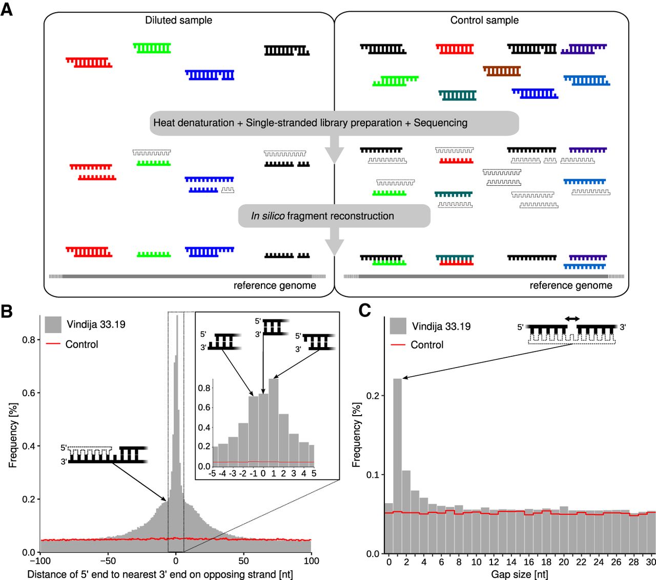 Identification of sequences from DNA strands originating from the same double-stranded DNA molecules. (A) Schematic overview of MatchSeq: DNA fragments isolated from ancient or recent biological material are diluted to a relatively small number, denatured by heat, converted into a single-stranded library, amplified, and deeply sequenced. Double-stranded fragments are then reconstructed in silico by identifying overlapping sequences mapping to the reference genome in reverse complementary orientation or in close proximity on the same strand. Sequences <35 bp cannot be confidently mapped to the reference and are discarded. The same analysis is performed for an equal number of control sequences obtained from shallow sequencing of a vast amount of artificially fragmented modern human DNA, in which sequences are expected to be distributed randomly across the reference genome. (B) Distribution of distances between the 5′ end of each sequence to the nearest 3′ end on the opposing strand obtained from Neanderthal DNA (Vindija 33.19; gray bars) and the control (red line). (C) Distribution of distances between sequence alignments on the same strand. Molecular structures putatively underlying the observed signals are indicated by schematic drawings. Filled DNA strands indicate sequences that were recovered; unfilled strands are hypothesized to be present but were not sequenced.