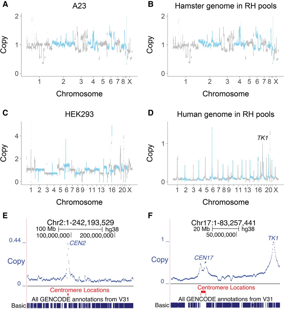 Genome copy number in the RH pools. (A) Hamster copy number deduced from reads in the A23 cells, normalized to a mean value of 1. (B) Hamster copy number averaged across the six RH pools. (C) Human copy number in the HEK293 cells. (D) Human DNA copy number (retention) averaged across the six RH pools. TK1 assigned retention of 1. (E) Increased retention of human centromere on Chromosome 2. (F) Increased retention of human centromere and TK1 on Chromosome 17.