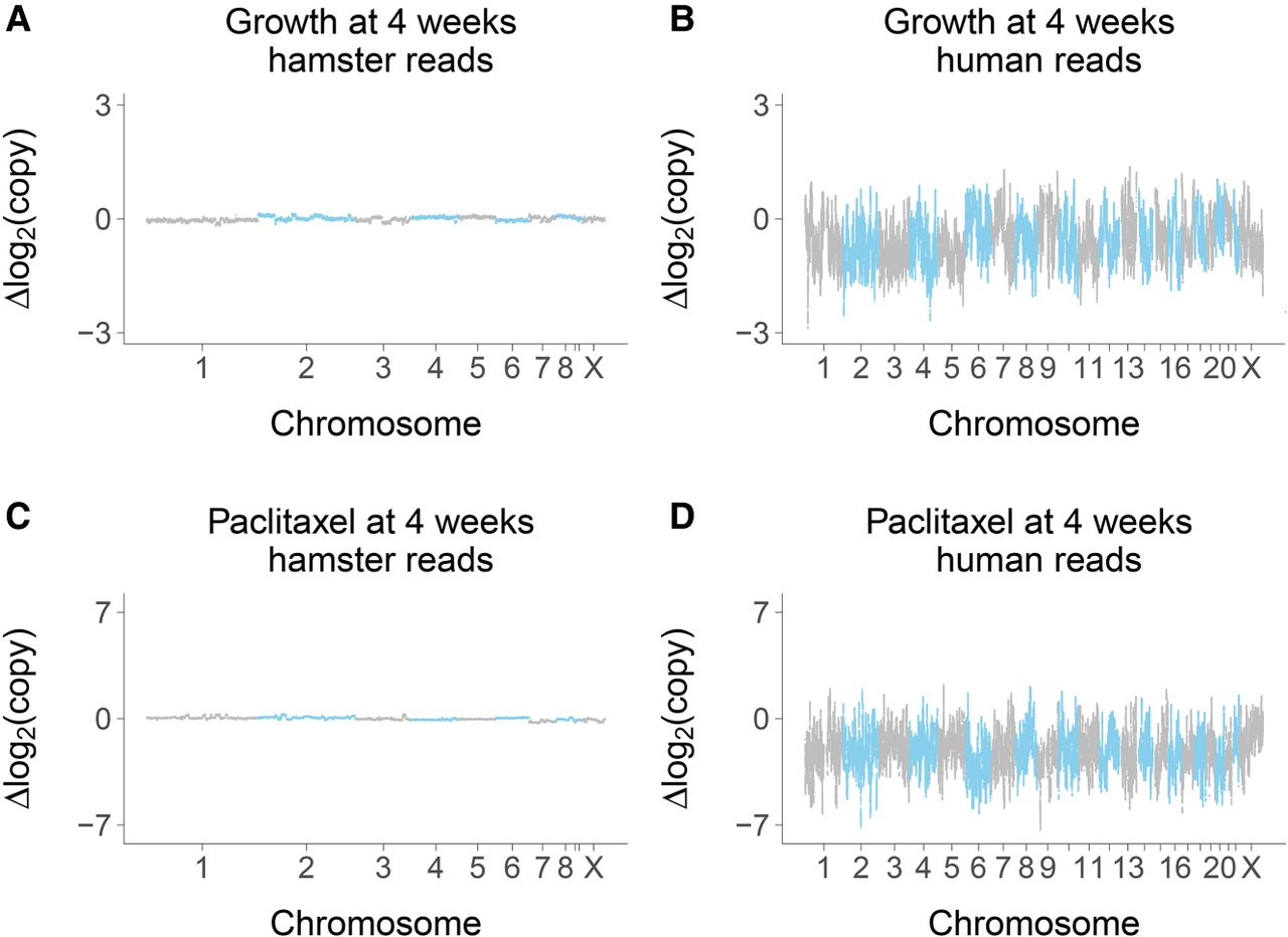 Copy number changes at week 4. (A) Hamster genome, growth at week 4 compared to week 0; 0 nM paclitaxel. (B) Human genome, growth at week 4 compared to week 0; 0 nM paclitaxel. (C) Hamster genome, 75 nM paclitaxel compared to 0 nM paclitaxel; week 4. (D) Human genome, 75 nM paclitaxel compared to 0 nM paclitaxel; week 4. Changes on log2 scale averaged across the six RH pools.