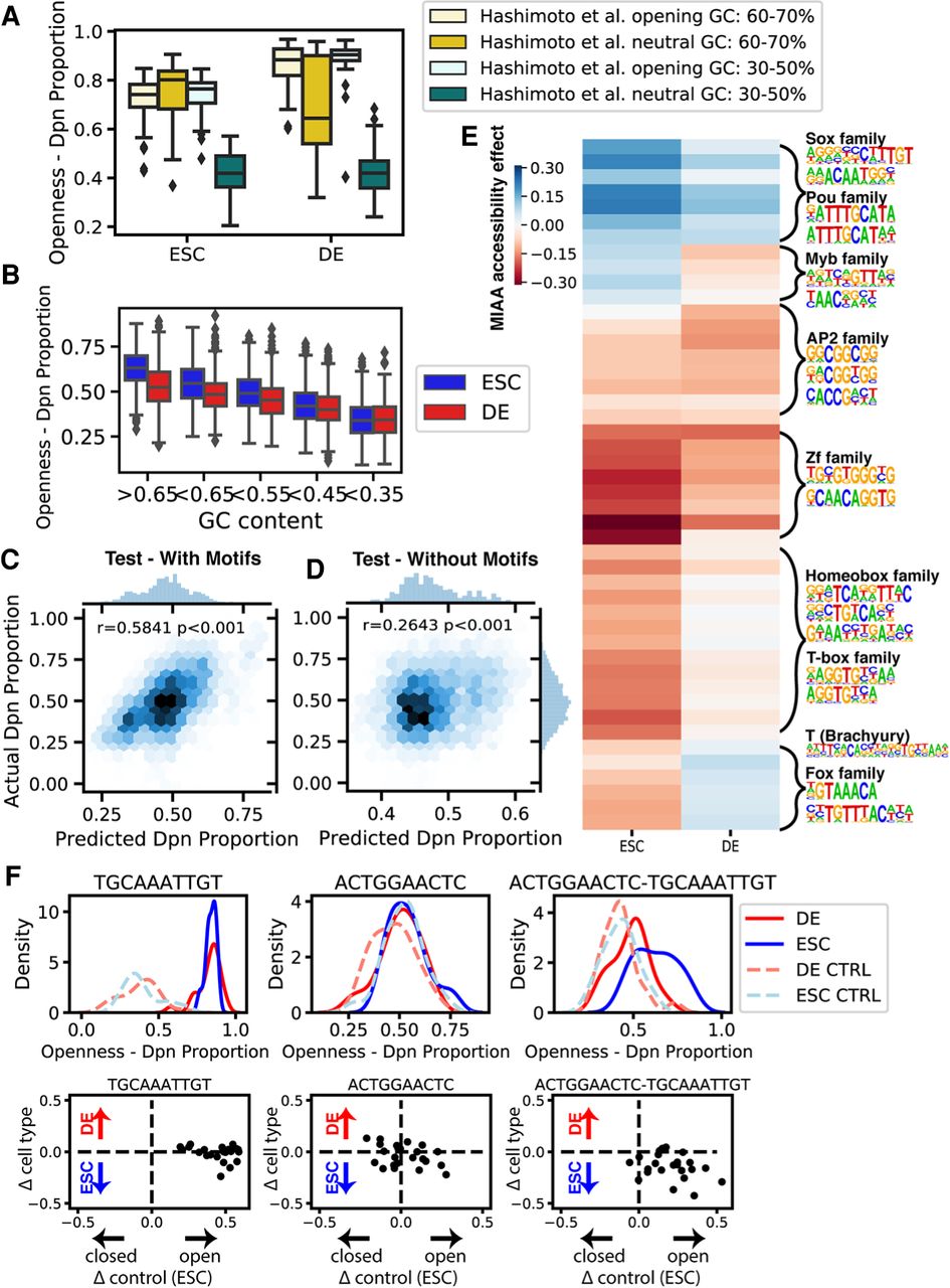 MIAA identifies global influence of GC-content and differentially accessible motifs. (A) GC-content observed to be correlated with accessibility in both stem and endoderm cells from positive (Hashimoto et al. opening) and negative (Hashimoto et al. neutral) control sequences. (B) GC-content correlated with accessibility in random DNA sequences. A regression model was trained on MIAA Dpn proportions with GC-content, replicate, and cell type–specific effects of 20 motifs and 26 motif pairs as features, and predicts well on (C) held-out test data (n = 4404) and performs significantly better than (D) a model trained without motif variables (adjusted R-squared motif model = 0.398; adjusted R-squared no motif model = 0.095). The correlation reported is the Pearson correlation coefficient (r). (E) Regression weights of individual motifs and motif pairs in stem and DE cells. Hierarchical clustering of regression weights followed by motif enrichment recovers clusters representing cell type–specific transcription factor DNA-binding motifs. (F) Example of individual motifs (left, middle) that alone do not result in differentially open chromatin but result in differentially open chromatin ESCs in combination (right). (Top row) Distribution of MIAA-measured accessibility in ESCs and DE cells for KMAC- or DeepAccess-generated motif, tested over 24 neutral sequence backgrounds and randomly shuffled DNA controls (CTRL). (Bottom row) Measurements for a particular DeepAccess or KMAC motif, in which each dot represents a single neutral background. The y-axis is the difference between endoderm and ESC accessibility, and the x-axis is the difference between each DNA sequence and its shuffled control in ESCs.