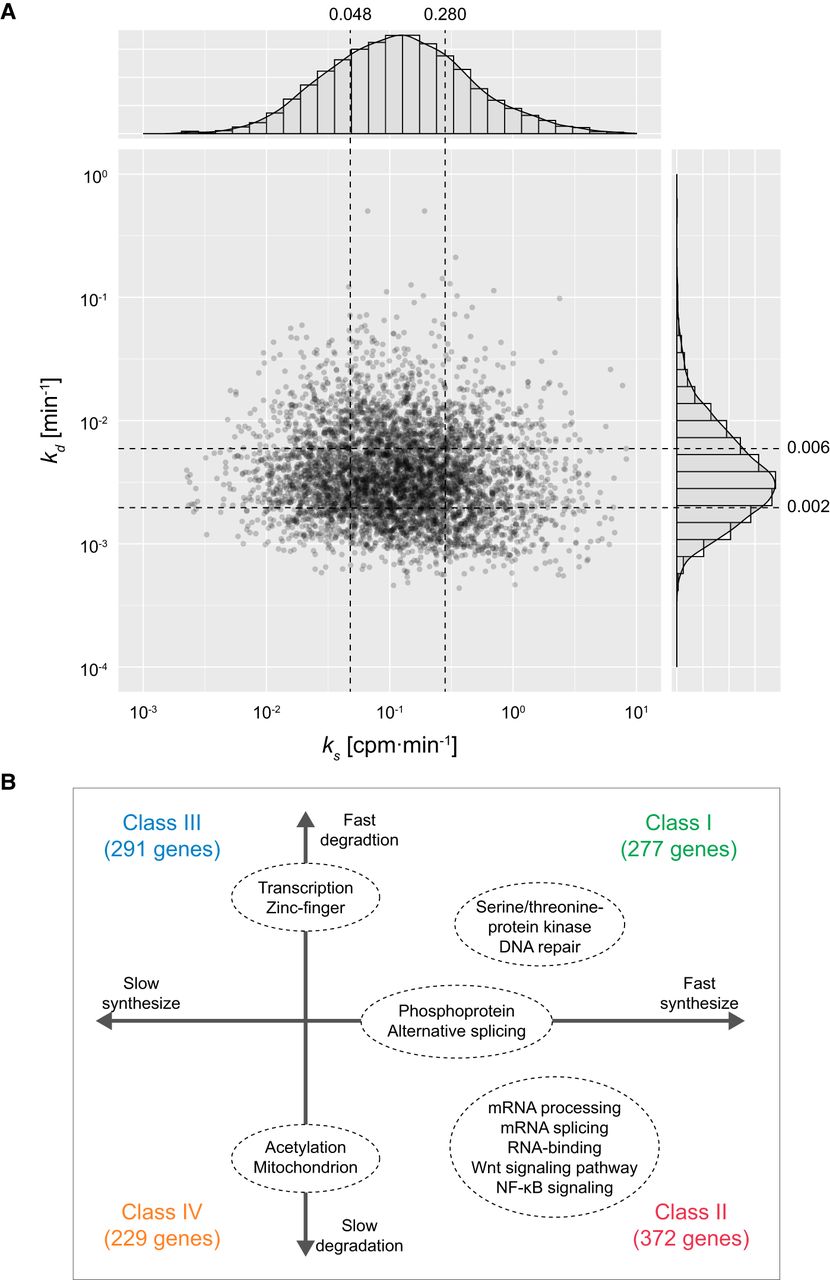 Joint distribution of RNA synthesis and degradation rates. (A) Joint distribution of RNA synthesis and degradation rates. Histograms of individual rates and a scatter plot are shown. The x- and y-axes indicate RNA synthesis rate (ks) and degradation rate (kd), respectively. The first and third quartiles of RNA synthesis and degradation rates indicated with black dashed lines were adopted as thresholds of the classification. (B) GO enrichment analysis of the genes classified using the RNA synthesis and degradation rates. Only representative terms significantly enriched for each class are shown.