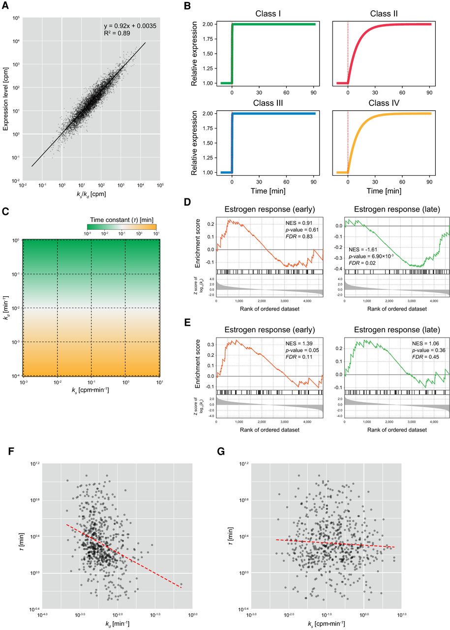 Effect of RNA synthesis and degradation rates on behavior of gene expression. (A) Comparison of ratios of RNA synthesis and degradation rates, with expression levels. The x- and y-axes indicate the ratio of RNA synthesis and degradation rates (ks/kd) and the expression level calculated based on the sequencing of Alkyl-RNAs (total RNA-seq reads with/without T > C conversion), respectively. Black solid line is the regression line based on log-transformed values. (B) Simulations of expression time series of genes imitating the characteristics of Class I (fast RNA synthesis and fast degradation), Class II (fast RNA synthesis and slow degradation), Class III (slow RNA synthesis and fast degradation), and Class IV (slow RNA synthesis and slow degradation). In each simulation, the RNA synthesis rates doubled at 0 min (red dotted line). (C) Time constants of expression of genes showing various RNA synthesis and degradation rates. The x- and y-axes indicate RNA synthesis rate (ks) and degradation rate (kd). Colors indicate the time constants (τ). (D,E) GSEA of degradation rate (D) and RNA synthesis rate (E) showing enrichment of “estrogen response (early)” and “estrogen response (late).” (NES) Normalized enrichment score. (F) Comparison of degradation rates (kd) and time constants (τ). The x- and y-axes indicate the degradation rate and time constants, respectively. Red dashed line is a regression line based on log-transformed values. (G) Comparison of RNA synthesis rates (ks) and time constants (τ). The x- and y-axes indicate the RNA synthesis rate and time constants, respectively. Red dashed line is a regression line based on log-transformed values.