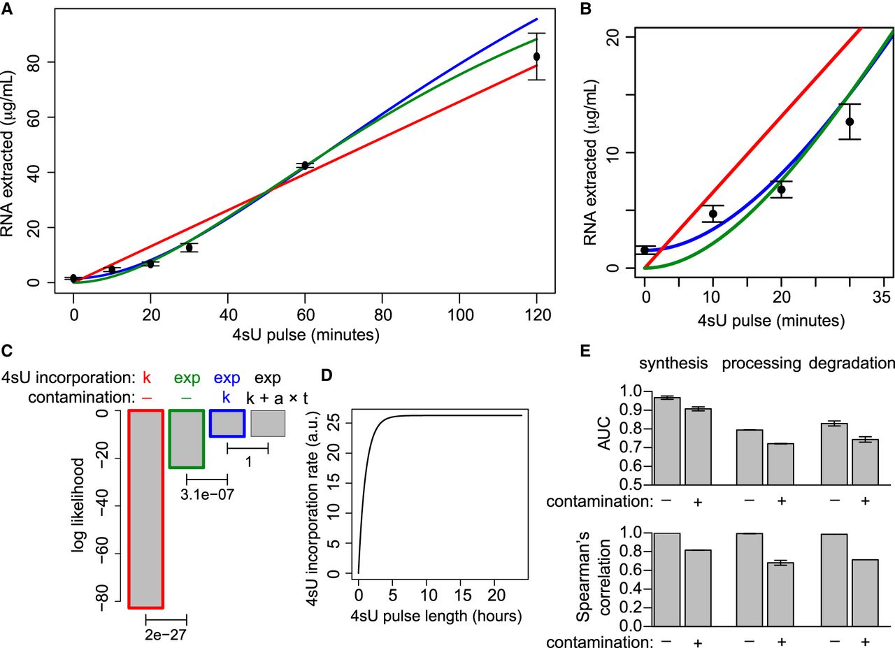 Contamination of 4sU labeled RNA with unlabeled RNA. (A) Yield of labeled RNA at 4sU pulses of different length in 3T9 mouse fibroblast cells. (B) A magnification of A. (C) Log likelihood score for the fit of four alternative models, considering constant (k) or exponential (exp) 4sU incorporation rates, combined with a contamination that is absent (−), constant (k), or linear to the 4sU pulse length (k + a × t). P-values of the indicated log likelihood-ratio tests are reported. (D) The estimated trend of 4sU incorporation based on the green model in panel A. (E) Changes in ROC areas under the curve (AUC) and in Spearman's correlation following the introduction of 30% contamination in simulated data.