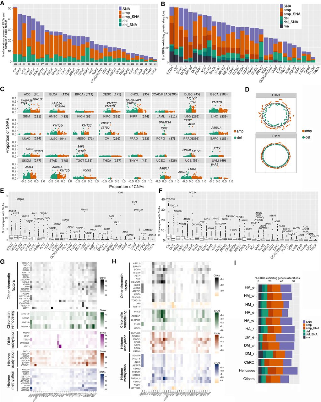 Pan-cancer analysis of genetic alterations across ERG categories and classes. (A,B) The percentage of samples with genetic deregulation in ERGs (A) and the percentage of ERGs showing different types of genetic deregulation (B), by cancer type. ERGs are considered altered if at least 1% of samples harbor these genetic aberrations. (C) Proportion of samples with SNAs versus that with deletions (−1, −2) or amplifications (+1, +2) in ERGs for each cancer type. Each gene is represented by two dots (red and green) depicting amplified and deleted CNAs, respectively. (D) Circos plots showing the relative amount of deregulation in CNAs by chromosomal distribution in two representative cancer types (LUAD and THYM, characterized by high and low CNA burden, respectively). The level of CNAs for each ERG was calculated as the proportion of samples considering all types of CNAs (amplification = +1, +2 and deletion = −1, −2) in ERGs in each cancer type. (E,F) Box plots showing the percentage of samples with SNAs (E) and deep CNAs (F) by gene and by cancer type. The most deregulated ERGs are highlighted for each cancer type. (G,H) Heatmaps representing the top genetically deregulated genes showing SNAs (G) and CNAs (H) in at least 10% and 15%, respectively, of the samples for any cancer type. Only samples with deep CNAs were included. ERGs are grouped into functional categories as indicated. (I) The percentages of ERGs that show genetic alteration among all cancer types by functional groups. Genetic alterations: (SNA) single-nucleotide alteration, (amp) deep copy number amplification, (amp_SNA) deep amplification co-occurring with SNA, (del) deep copy number deletion, (del_SNA) deep deletion co-occurring with SNA, and (ma) multiple alterations. In cases in which both types of CNAs (amplification and deletion) of one gene were present in the samples, we reported in B and H the alteration that was at least twice as prevalent as the other; otherwise, the alteration was reported under the multiple alteration category.