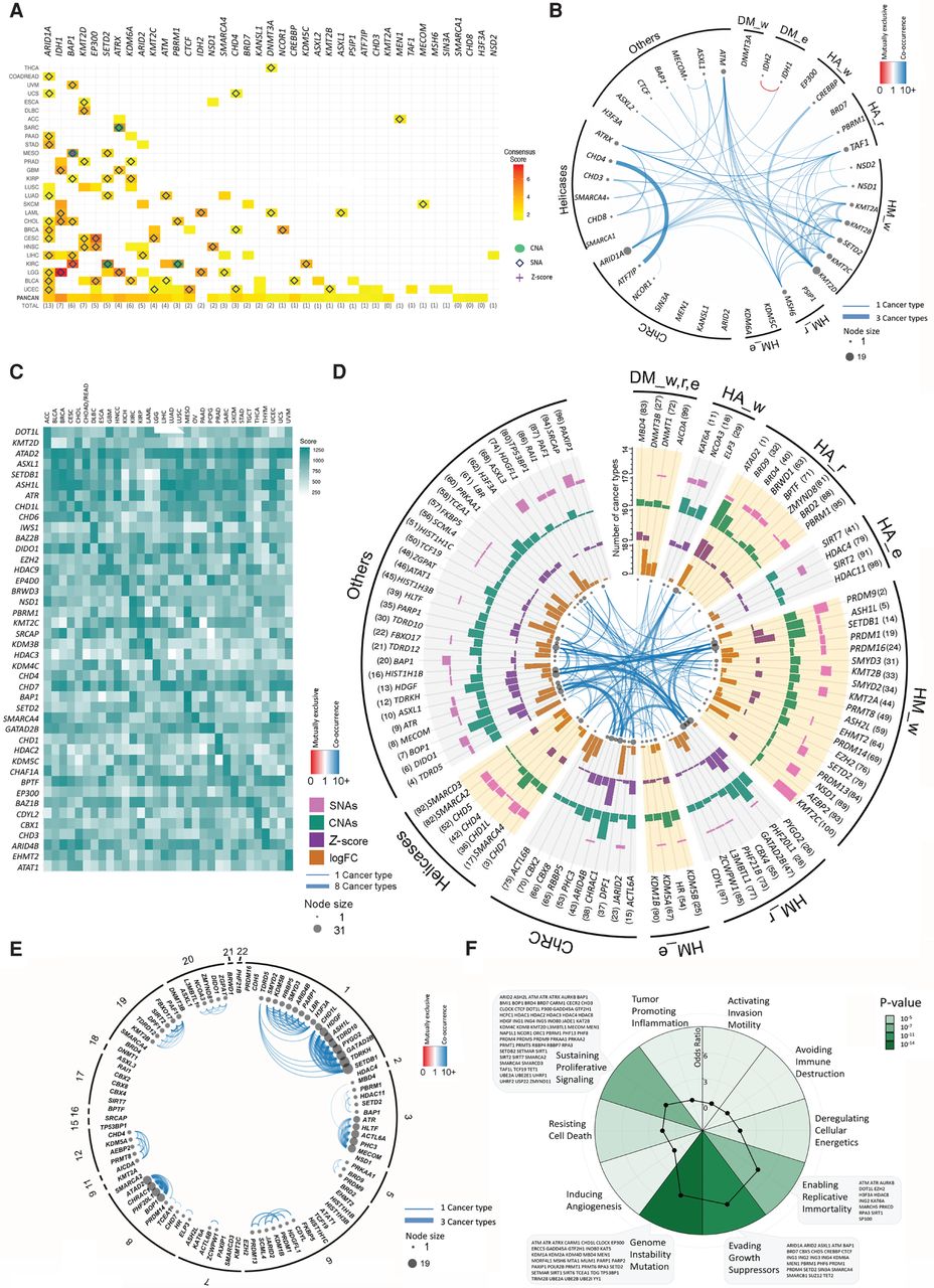 Characterization of ERG driver potentials. (A) Heatmap showing the ConsensusDriver scores (with values ranging from 1.5 to 7.5) as obtained by Bailey et al. (2018). ERGs with a score ≥ 1.5 in at least one cancer type are shown. The top 10 deep amplifications or deletions (green circles), SNAs (blue empty diamonds), or significant Z-score (purple crosses) of each cancer are overlapped onto the heatmap. (B) Significant (FDR < 0.05) co-occurrence and mutual exclusivity for ConsensusDriver ERGs in a pan-cancer analysis. The node size is proportional to both the number and thickness of its connections with other nodes. Blue and red edges represent co-occurrence (odds ratio [OR] > 1) and mutual exclusivity (OR < 1), respectively. The transparency of the edges indicates the average OR across cancer types, and their thickness is proportional to the number of cancer types in which the OR is significant. The co-occurrence filter was set to at least 5% of the samples per cancer type (Methods). (C) Heatmap of the Multi-Omics Driver scores of ERGs per cancer type. The ERGs shown represent a pooled set of the top three ERGs in each cancer type, as ranked by the mutli-omics driver score. (D) Top 100 ERGs by Pan-Cancer Driver score using SNA (5% of samples), CNA (5% of samples), and expression data (15% of samples with significant Z-score or FDR < 0,05 with log10FC > 1). Results are represented as bar plots counting the number of cancers in which a given gene has a particular genomic or expression alteration. From outer to inner track: (1, pink) SNAs; (2, green) CNAs; (3, purple) Z-score; (4, orange) log10FC. Inside the last track, co-occurrence or mutual exclusivity was calculated as in B, except that the co-occurrence filter was set to at least 10% of the samples per cancer type. Genes are aggregated by their functional features. (E) Significant co-occurrence for the top 100 ERGs by Pan-Cancer Driver score. Co-occurrence or mutual exclusivity was calculated as in D but ordered instead by chromosome number. (F) Spider pie chart showing enrichment of the 426 ERGs in pathways affecting the 10 hallmarks of cancer; the corresponding P-values and ORs are illustrated by green gradients and black spots, respectively. The names of ERGs overlapping with the four significantly enriched hallmarks are indicated.