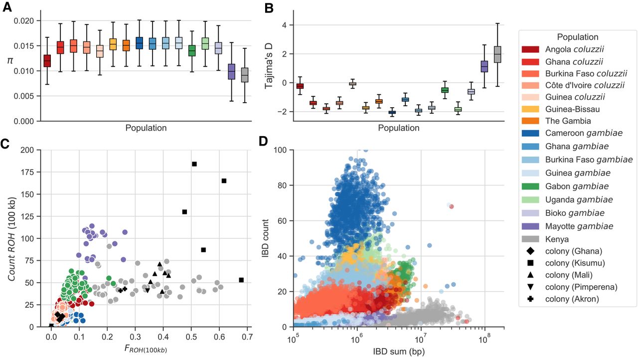 ) calculated in nonoverlapping 20-kbp genomic windows using SNPs from euchromatic regions of Chromosome 3. (B) Tajima's D calculated in nonoverlapping 20-kbp genomic windows using SNPs from euchromatic regions of Chromosome 3. (C) Runs of homozygosity (ROH) in individual mosquitoes. Each marker represents an individual mosquito. (D) Runs of identity by descent (IBD) between individuals. Each marker represents a pair of individuals drawn from the same