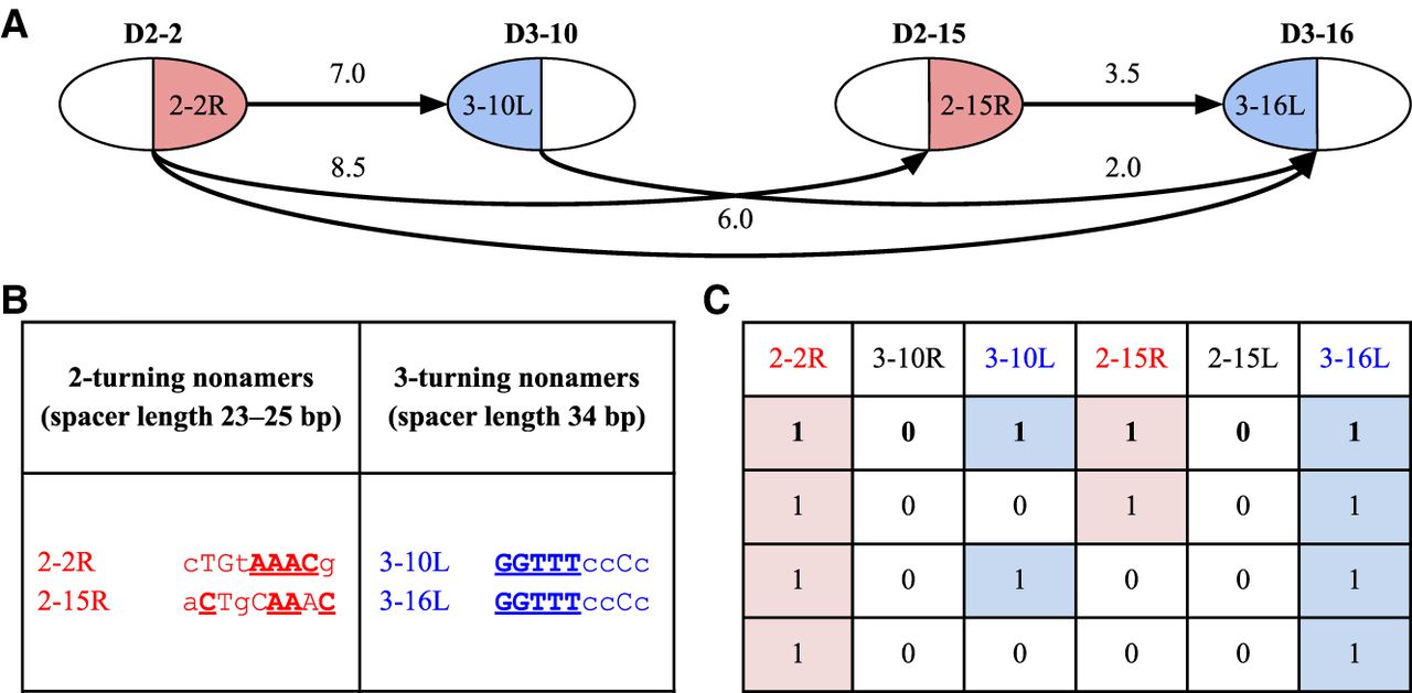 Fusion graph on genes D2–2, D3–10, D2–15, and D3–16 (A), cryptic nonamers in RSSs of these genes that explain this graph (B), and four optimal configurations for this graph (C). (A) Fusion graph on genes D2–2, D3–10, D2–15, and D3–16. Each cryptic nonamer is shown as either a blue left half-vertex or a red right half-vertex of the corresponding vertex in the fusion graph. Edges represent tandem fusions and are labeled with the tandem coefficient for the corresponding fusion. The edge between D3–10 and D2–15 is not shown since these genes do not form tandem fusions. (B) The table shows that all cryptic nonamers in RSSs of genes D2-2, D3-10, D2-15, and D3–16, found among the top 12 nonamers, correspond to 2- and 3-turning nonamers; 2- and 3-turning cryptic nonamers explain all edges of the fusion graph and do not “trigger” any other edges. Conserved positions in these nonamers are shown by uppercase letters. Positions coinciding with the consensus sequence of the canonical nonamers are bolded and underlined. (C) The table shows four optimal configurations of cryptic RSSs (i.e., configurations explaining all edges of the fusion graph) for the fusion graph on genes D2-2, D3-10, D2-15, and D3-16. Each configuration is shown as a binary vector, where 1 (0) means that the corresponding cryptic nonamer forms (does not form) tandem fusions.