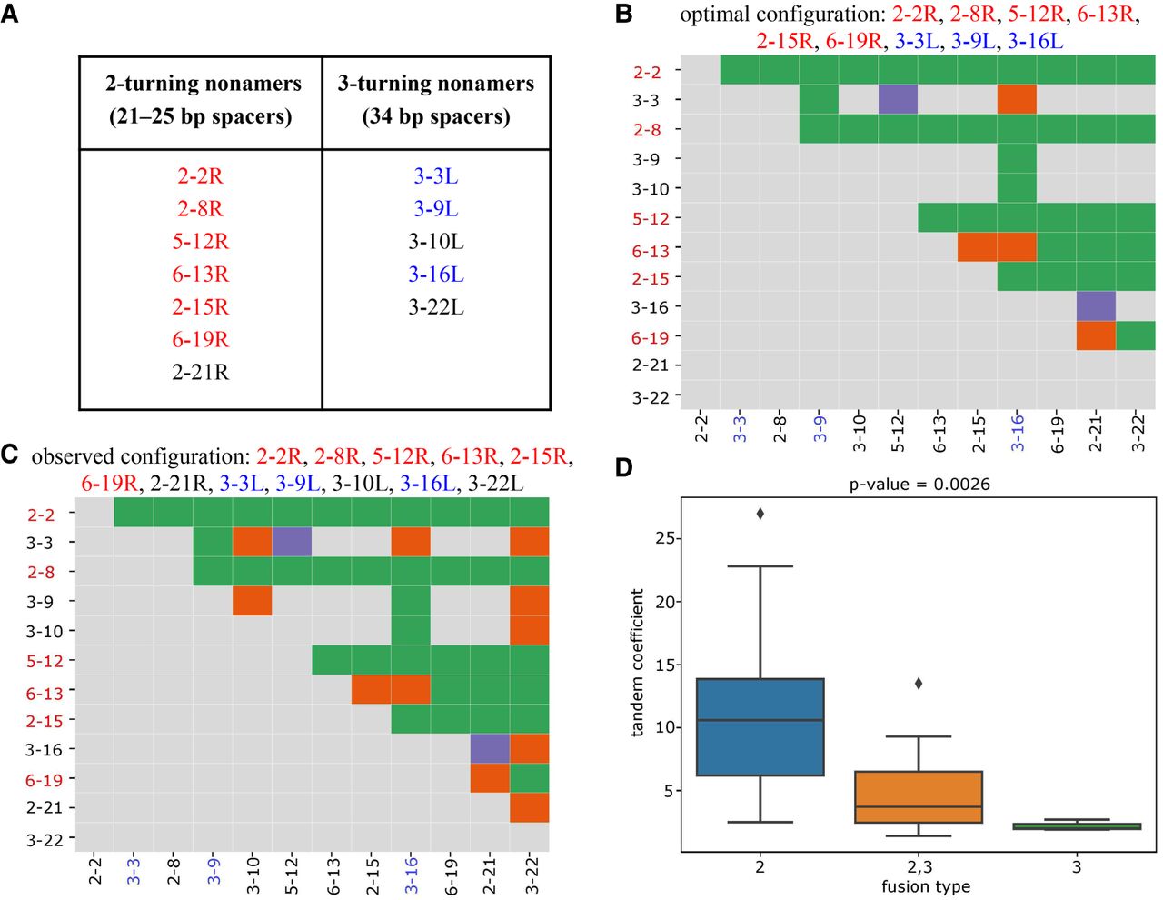 RSSs with cryptic nonamers corresponding to 2- and 3-turn spacers explain the fusion graph in Figure 2A. (A) 2- and 3-turning nonamers that “explain” the fusion graph in Figure 2A are highlighted in red and blue, respectively. (B,C) The fusion matrices with each cell classified as explained (green), unexplained (purple), or false (orange) based on the optimal configuration with nine (6 left + 3 right) cryptic nonamers (B) and the observed configuration with 12 (7 left + 5 right) cryptic nonamers (C). A D gene on the y-axis (x-axis) is colored red (blue) if its right (left) RSS contributes to the optimal configuration. (D) Each tandem fusion in Figure 2 is classified by the number of turns in cryptic nonamers that can explain it. For example, the fusion (D2-2, D3-3) can be explained by both 2–turning and 3–turning nonamers and thus is classified as “2,3 fusion type.” In total, we generate three groups: “2” (fusions are explained by the 2–turning nonamers), “2,3” (fusions are explained either by the 2-turning or by the 3–turning nonamers), and “3” (fusions are explained by the 3-turning nonamers) with average values of tandem coefficients 10.7, 5.0, and 2.2, respectively. The y-axis shows tandem coefficients of tandem fusions. Group “2” has higher values of tandem coefficients that groups “2,3” and “3” (P-value = 0.0026 according to the one-way ANOVA test [Heiman 2001]).