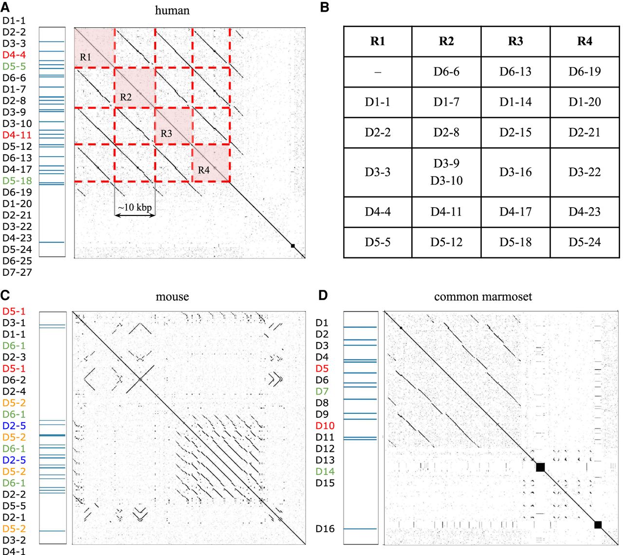 Tandem repeats in IGHD locus of human (A,B), mouse (C), and common marmoset (D) IGHD loci. Duplicated and identical IGHD genes are shown by the same (nonblack) color. Dot plots were generated by the Gepard tool (Krumsiek et al. 2007). (A) The dot plot shows that the 56-kbp-long human IGHD locus contains a tandem repeat R1-R2-R3-R4 covering 24 out of 27 IGHD genes. Positions of 27 IGHD genes are shown on the left. (B) The structure of units R1–R4. (C) For better resolution, we show only a 97-kbp-long fragment of the 1.1-Mbp-long mouse IGHD loci that covers 22 out of 26 IGHD genes. The shown fragment does not cover genes IGHD4–1, IGHD5–2, and IGHD1–3 that precede the first occurrence of IGHD5-1 (the first gene in the dot plot) and a copy of gene IGHD4-1 that follows IGHD4-1 (the last gene in the dot plot). (D) A dot plot shows the 47-kbp-long IGHD locus of the common marmoset.