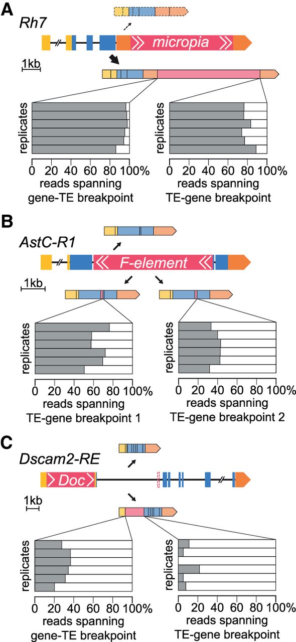 High penetrance of transposon-containing splice isoforms. (A) Schematic showing Rhodopsin 7 locus harboring a sense micropia in the 3′ UTR and two splice isoforms. Gray bars show percentage of reads spanning the gene-TE (left) and TE-gene (right) breakpoint in each of the six tested replicates. (B) The AstC-R1 gene harbors an antisense F-element immediately upstream of the second exon that introduces cryptic splice sites. Three spliced isoforms are shown. (C) Dscam2 harbors a sense Doc in its 5′ UTR (in addition to a blood insertion in its first intron) (Supplemental Fig. S6). For ease of visualization, only the shortest Dscam2 isoform, RE, is depicted. The blood insertion is indicated with a dashed box. See Supplemental Table S5 for complete list.