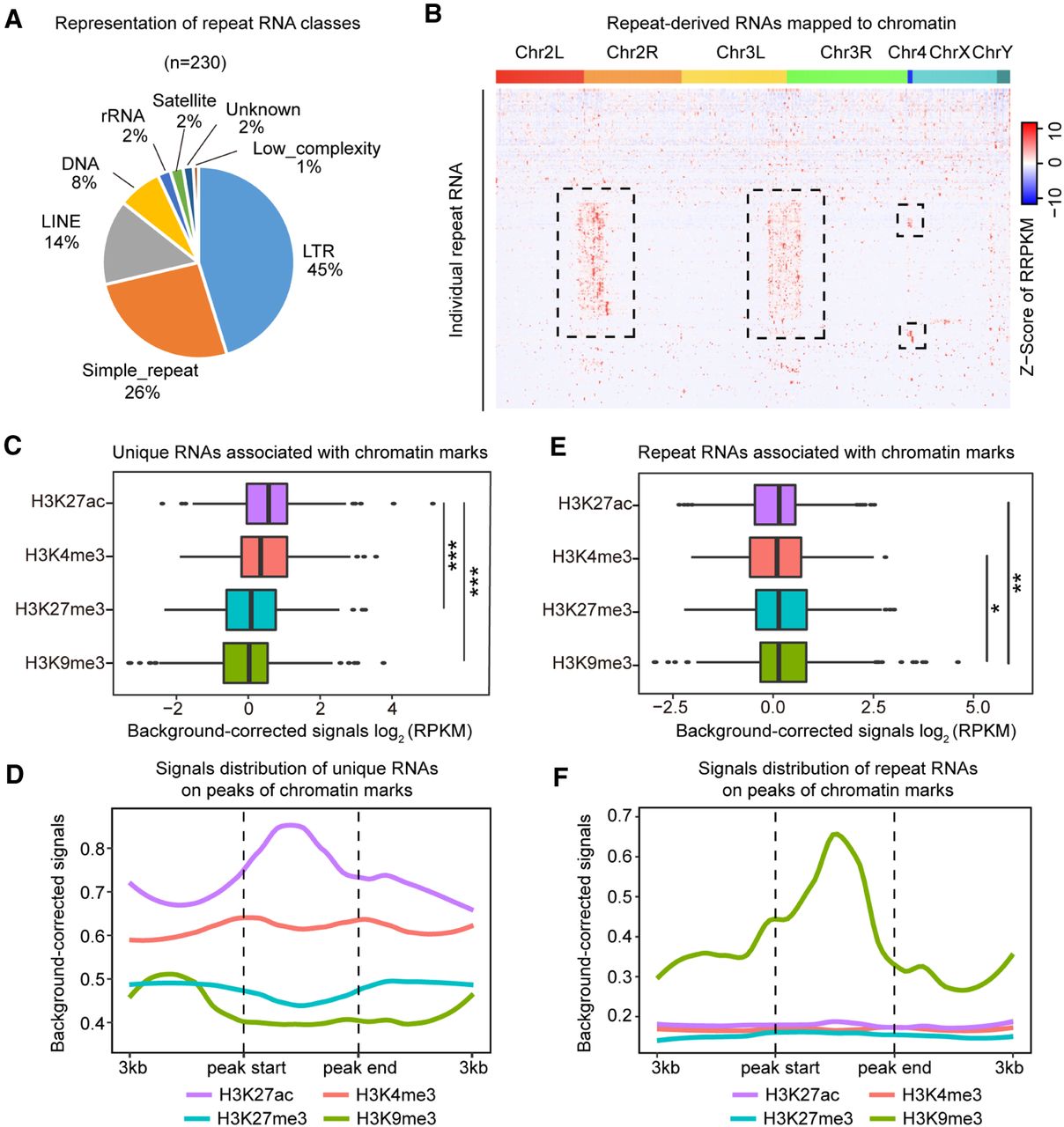 Interaction of distinct RNA classes with eu- versus heterochromatin. (A) Different repeat RNA classes represented by 230 DNA-bound repeat-derived RNAs. (B) Heat map showing the distribution of individual 230 repeat-derived RNAs across the Drosophila genome in S2 cells. (Row) Individual chromatin-associated repeat-derived RNAs, (column) AluI DNA bins, (boxed regions) repeat-derived RNAs that showed preferential binding to constitutive heterochromatin in pericentromeric regions. (C) Association of chromatin marks with background-corrected signals of unique RNAs. (***) P < 0.001 (unpaired Student's t-test). (D) Distribution of unique RNA interaction signals around chromatin mark peaks. (E) Association of chromatin marks with background-corrected signals of repeat-derived RNAs. (*) P < 0.05, (**) P < 0.01 (unpaired Student's t-test). (F) Distribution of repeat RNA interaction signals around chromatin mark peaks.