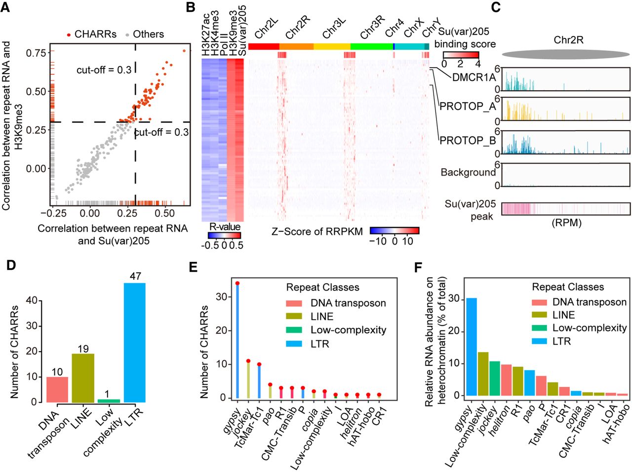 Prevalent association of gypsy-derived RNAs with constitutive heterochromatin. (A) Scatterplot of colocalization coefficients between repeat-derived RNA signals on DNA and the levels of H3K9me3 (y-axis) or HP1 (x-axis) in S2 cells. A threshold of 0.3 was chosen for both chromatin marks (red lines). Dashed lines were used to differentiate CHARRs (red dots) from other repeat-derived RNAs (gray dots). (B) Left: Heat map of colocalization of each CHARR with individual chromatin marks or Pol II ChIP-seq signals. Right: Heat map of chromatin interaction of each CHARR with AluI-generated DNA bins, which were merged from 100 continuous AluI DNA bins. HP1 binding signals in these DNA bins are displayed below the schematic presentation of Drosophila chromosomes. Three representative CHARRs are labeled on the right. (C) Chromatin interaction signals of three representative CHARRs, DMCR1A, PROTOP_A, and PROTOP_B on a genomic region in Chromosome 2R in comparison with nonspecific background based on human RNA mapped to fly DNA and HP1 binding density. All signals were scaled to reads per million. (D,E) The number of repeat classes (D) or subfamilies (E) associated with CHARRs. (F) The relative RNA abundance (% of total) of CHARRs on constitutive heterochromatin and specific subfamilies to which they belong. Colors show the RNA classes to which individual CHARR subfamilies belong.