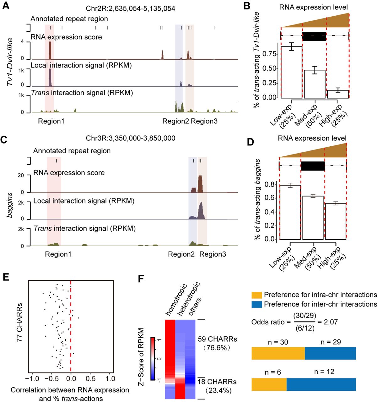 Reverse correlation between local transcription and association with trans-acting RNAs on chromatin. (A) A representative genomic region showing Tv1-Dvir-like transcription loci and interactions with Tv1-Dvir-like subfamily RNAs produced either locally or from other chromosomes (trans-acting RNAs). Three annotated Tv1-Dvir-like transcription regions are indicated at the bottom. (B) Tv1-Dvir-like subfamily-derived RNAs were segregated into three groups according to their levels of transcription (bottom 25%, middle 50%, and top 25%). Bars indicate the percentage of trans-acting Tv1-Dvir-like RNAs on the transcription loci in each group. (C,D) Similar analysis and illustration for another typical CHARR baggins as in A and B. (E) Pearson's correlation for individual CHARRs between their expression and the percentage of associated trans-acting RNAs from the same subfamilies. (F) Tendencies of CHARRs engaging homotropic versus heterotropic interactions based on normalized reads per kilobase per million (left). The two classes of CHARRs were further separated into those with preference for inter- (yellow) or intra- (blue) chromosomal interactions (right), as indicated in Figure 4.