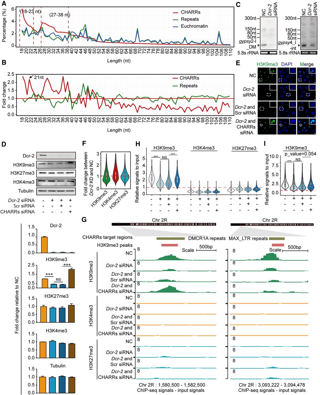 Trans-acting repeat-derived RNAs for heterochromatin maintenance. The length distribution in 1-nt bins based on the combined ChAR-seq data set (A), and at each bin, reads from CHARRs (red) or other repeats (green) were normalized against those from euchromatin RNAs (B). (C) Confirmation of Dcr-2-dependent expression of gypsy2-I_DM (left) and gypsy4_I-int (right) expression by northern blotting analysis. (D) Western blotting analysis of Dcr-2, H3K9me3, H3K27me3, H3K4me3, and Tubulin in S2 cells in response to siRNA-mediated knockdown of Dcr-2 and rescue with a transfected pool of CHARR-derived synthetic siRNAs. Quantified data are shown below as fold-change (FC) relative to mock-treated cells (NC) in lane 1. Data are presented as mean ± SEM (n = 3 biological replicates). (***) P < 0.001, (NS) not significant (unpaired Student's t-test). (E) H3K9me3 detected by immunocytochemistry in S2 cells treated with different combinations of siRNAs, as indicated. (Green) H3K9me3 signals, (blue) DAPI. Scale bar, 2 μm. (F) Violin plot for fold-change of H3K9me3, H3K4me3, and H3K27me3 signals on targeted peaks in response to Dcr-2 knockdown. (KD) Knockdown. (G) H3K9me3 ChIP-seq signals on representative genomic loci, one corresponding to a CHARR-target locus (left) and a non-CHARR-target locus (right) in response to Dcr-2 knockdown, complemented with either scrambled or derived siRNAs. ChIP-seq signals for euchromatin (H3K4me3) or facultative heterochromatin (H3K27me3) were shown for comparison. (H,I) H3K9me3 signals on targeted (H) or nontargeted (I, with <50% sequence homology to any of derived siRNAs) regions in response to Dcr-2 knockdown, complemented with either scrambled or derived siRNAs. (***) P < 0.001 (Student's t-test). H3K27me3 and H3K4me3 binding signals were displayed for comparison.
