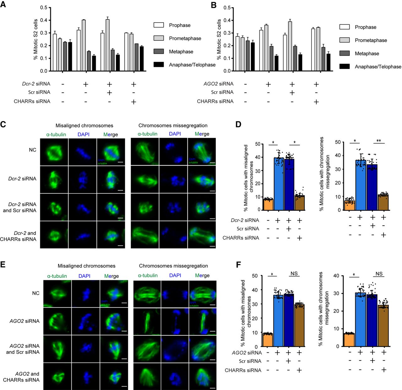 CHARRs can rescue Dcr-2 knockdown- but not AGO2 knockdown-induced cell division defects. (A,B) Percentages of S2 cells at each stage of mitosis in response to knockdown of Dcr-2 (A) or AGO2 (B) and treatment with either scrambled or derived siRNAs. n = 50 for each experiment. (C) Dcr-2 knockdown-induced chromosomes misalignment (left) and missegregation (right) and rescue by derived siRNAs, but not scrambled siRNA. (Green) Stained α-tubulin, (blue) DAPI. Scale bar, 2 μm. (D) Percentages of S2 cells at metaphase exhibiting misaligned chromosomes (left) and anaphase exhibiting lagging chromosomes (right) at different experimental conditions. n = 50 for each condition. (*) P < 0.05, (**) P < 0.01 (multiple group Student's t-test). (E,F) Similar to C and D except on AGO2 knockdown cells. n = 50 for each condition. (*) P < 0.05, (NS) not significant (multiple group Student's t-test).