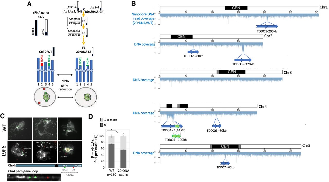 Genomic instability in the 20rDNA line L6F6. (A) Schematic representation of obtaining the 20rDNA L6F6 and its relative content in rRNA gene copies. NOR2 and NOR4 rRNA gene copies are both affected by the reduction, and according to the DNA-FISH experiment, it changes their nuclear distribution in the nucleus compared to wild-type Col-0 (WT), because all rRNA gene copies associate with the nucleolus (Pavlištová et al. 2016). (B) Distribution of the reads obtained by nanopore sequencing along all chromosomes in the 20rDNA L6F6 line compared to wild-type Col-0. The blue arrows represent the localization and the orientation of the TDDO identified in L6F6, except for TDDO5, which is represented by a green arrow. (C) DNA-FISH analyses of two loci present on the short arm of Chromosome 4 (kr4s), distant by 1.6 Mb: one present on the TDDO4 (BAC T5H22; green) and one located outside the TDDO4 (BAC F5I10; red). Three Pachytene chromosomes from WT Col-0 and in 20rDNA L6F6 are shown. A zoom of the unlooped kr4s from the middle panel of the 20rDNA line6 is presented at the bottom of the panel. (D) Histogram showing the percentage of nuclei displaying at least one P-γ-H2Ax foci in WT Col-0 versus L6F6.