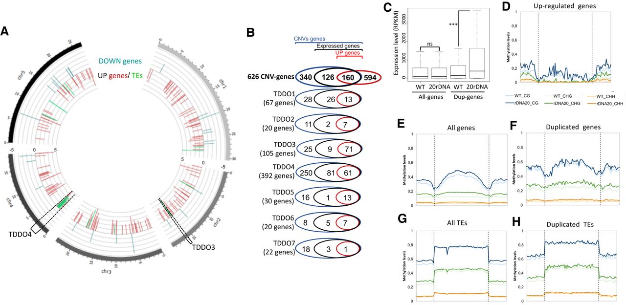 Impact of TDDO on global gene expression and cytosine methylation in L6F6. (A) Representation of the chromosomal position of genes (red bars) and TEs (green bars) of differentially accumulated transcripts in the 20rDNA L6F6 versus WT Col-0 with an adjusted P-value < 0.01 and a log2(fold change) > 2. Data are displayed using Circos (Krzywinski et al. 2009). The brackets display the position of TDDO3 and TDDO4. (B) Venn diagrams representing the proportion of expressed genes (containing at least two reads/genes in wild-type) and up-regulated genes (P-value < 0.01, FC > 2) among all the duplicated genes or in each TDDO in L6F6. (C) Dot plot revealing the relative expression of all genes or duplicated (DUP) genes in leaves of 3-wk-old plants in WT Col-0 or in 20rDNA L6F6. (***) P-value = 0.0005 was calculated using a Wilcoxon test. (D–H) Global DNA methylation analyses from genome-wide bisulfite sequencing experiments in WT Col-0 versus the 20rDNA L6F6. Global CG, CHG, and CHH methylation are shown for up-regulated genes with an adjusted P-value < 0.01 and a log2(fold change) > 1.5 (D), all genes (E), duplicated genes (F), all TEs (G), and duplicated TEs (H).