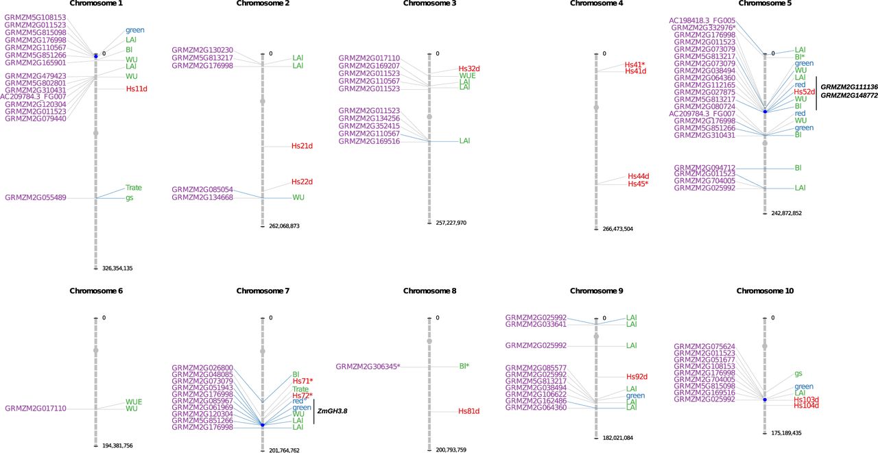 Genomic position of the colocalizing pQTLs, coQTLs, and QTLs. The positions of the 15 pQTL hotspots confidently identified as loci with potential pleiotropic effects are indicated, as well as the positions of the most promising candidate genes. Chromosomes are segmented into 10-Mb bins. Gray dots represent the centromeres and blue dots indicate the position of genomic regions showing evidences for pleiotropy at both the proteome and phenotype level. Blue lines indicate colocalizations with QTLs that are determined by a same SNP. (°) WD-specific module; (*) colocalization found in the WW condition.