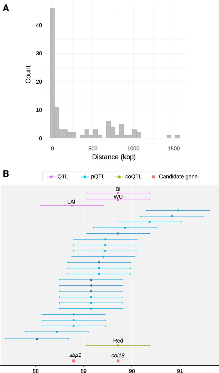 Identification of genomic regions associated with trait variations at multiple scales. (A) Distribution of the distances between colocalizing QTLs and pQTLs. (B) Detailed view of the QTL, pQTL, and coQTL detected in the region covered by the Hs52d hotspot on Chromosome 5. Dots represent the SNPs determining the position of the QTLs, and horizontal bars represent the linkage disequilibrium-based window around each SNP. Black circles indicate the pQTLs that colocalize with QTLs or coQTLs with a high correlation between protein abundance and the phenotypic trait value or the module eigengene. The position of two transcription factors, sbp1 (GRMZM2G111136) and col18 (GRMZM2G148772) that represent promising candidate genes, are indicated.
