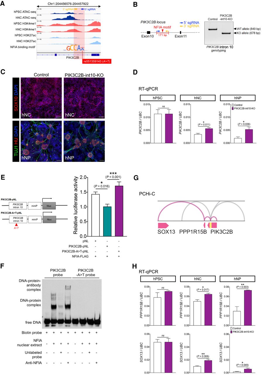 Characterization of a novel S-HSCR-associated regulatory element in intron 10 of PIK3C2B. (A) Overview of ATAC-seq and ChIP-seq profiles showing the putative hNC-specific regulatory element in PIK3C2B intron 10. The red shaded region indicates the location of the regulatory element and the line shows the A > T variant (rs551359143) found exclusively in the S-HSCR cases that disrupts the NFIA binding motif. The motif is not drawn to the same scale as the genomic signal tracks, with magnified characters. (B) Design of sgRNAs used for the CRISPR-Cas9 system for deleting the regulatory element. Genotyping reveals the specific deletion of the 171-bp fragment in intron 10 of PIK3C2B in the PIK3C2B-int10-KO hPSC line. (WT) Wild type, (KO) knockout. (C) Immunostaining shows that both the control and mutant (PIK3C2B-int1-KO) lines have comparable capability to make hNCs and hNPs. Scale bars: (hNC) 100 μm; (hNP) 200 μm. (D) RT-qPCR shows the changes in the expression of PIK3CB in different cell stages in the control and mutant lines. t-test, (ns) not significant. n = 3–4 per group. (E) Design of the constructs used for the luciferase assay. The bar chart shows the relative luciferase activities when the cells were transfected with different sets of constructs as indicated. Three independent assays were performed, each in triplicate. One-way ANOVA. (F) Gel mobility shift assays were performed with biotin-labeled probes containing the PIK3C2B intron 10 regulatory element with or without the A > T conversion and the nuclear extract from NFIA-overexpressing cells, in the presence of unlabeled probes or anti-NFIA antibody (0.1 µg). (G) Significant contacts (FDR < 0.05) in the promoter capture Hi-C data from GM12878 cells at the PIK3C2B locus. The putative regulatory element in intron 10 of PIK3C2B is marked in yellow. Contacts between the regulatory element and the TSSs of SOX13, PPP1R15B, and PIK3C2B are shown in purple curves, while contacts between the regulatory element and other promoters are shown in gray curves. Contacts that extend too far are trimmed. (H) RT-qPCR analysis shows the changes in the expression of PPP1R15B and SOX13 in the control and the mutant lines at different cell stages. t-test, (ns) not significant. n = 3–4 per group.
