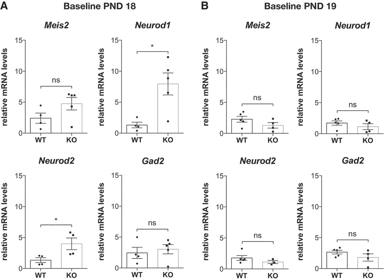 Baseline gene expression at PND 18 and PND 19. (A) At PND 18, mRNA was purified from 5000 GD1 cells; inhibitory and excitatory marker expression levels were quantified by RT-qPCR and compared between WT and Fmr1-KO brains. Baseline marker expression in both genotypes is presented respective to the expression of WT neurons subjected to aiFACS (input WT). Results are presented as the mean ± SEM, Mann–Whitney U test; (*) P < 0.05; (ns) not significant. For Meis2, Neurod1, and Gad2: WT, n = 4; Fmr1-KO, n = 5. For Neurod2: WT, n = 4; Fmr1-KO, n = 4. Each n corresponds to two (nonlittermate) mouse brains and is the mean of two independent replicates. (B) At PND 19, mRNA was purified from 5000 GD1 cells, and inhibitory and excitatory markers expression levels were quantified by RT-qPCR and compared between WT and Fmr1-KO brains. Baseline marker expression in both genotypes is presented respective to the expression of WT neurons subjected to aiFACS (input WT). Results are presented as the mean ± SEM, Mann–Whitney U test; (ns) not significant. For Meis2, Neurod1, and Gad2: WT, n = 5; Fmr1-KO, n = 4. For Neurod2: WT, n = 5; Fmr1-KO, n = 3. Each n corresponds to two (nonlittermate) mouse brains and is the mean of two independent replicates.