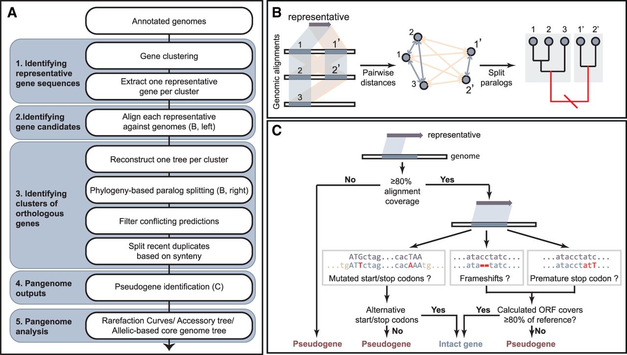 A brief overview of the workflow for PEPPAN. (A) Flow chart indicating the five cascading groups of operations (blue-gray) from top to bottom. (B) Cartoon of similarity-based prediction of gene candidates (left) and phylogeny-based paralog splitting (middle and right). The tree was split at the red branch (right) to separate gene candidates into two subclusters. The gene pairs in the same subcluster had low paralogous scores (blue-gray quadrilaterals [left] and arrows [middle]), whereas gene pairs between the subclusters had high paralogous scores (yellow). (C) Flow chart of the pseudogene identification. The detailed workflow of the algorithm implemented in PEPPAN can be found in Supplemental Fig. S1 and Supplemental Text 1.
