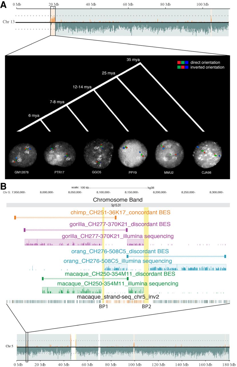 Evolutionary history of two inversions. (A) Strand-seq view of Chromosome 13 shows the switch in orientation of a 2-Mbp region, suggesting the presence of an inversion (Chr13_inv1). The region was tested using FISH in interphase nuclei in multiple primate species and was inverted just in macaque, whereas all the other primates are in direct orientation similar to human. (HSA) Homo sapiens; (PTR) Pan troglodytes; (GGO) Gorilla gorilla; (PPY) Pongo pygmaeus; (MMU) Macaca mulatta; (CJA) Callithrix jacchus. (B) Strand-seq view of a 89-kbp inversion (Chr5_inv2) between BP1 and BP2 is shown. BES mapping and Illumina sequencing of primate clones show that the region is inverted in gorilla, orangutan, and macaque and is direct in chimpanzee.