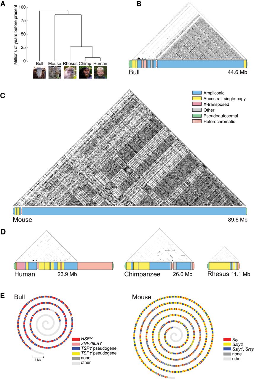 Structure and ampliconic sequence content of bull, mouse, and primate Y Chromosomes. (A) Phylogenetic relationships among five species with SHIMS-assembled MSY sequences. Branch lengths are drawn to scale to indicate species divergence times. Nonhuman photos from Unsplash.com. (B–D) Triangular dot plots, to scale, of DNA sequence identities within the euchromatic MSYs of bull (B), mouse (C), and primates (human, chimpanzee, and rhesus) (D). Each dot represents 100% intrachromosomal identity within a 200-bp window. Direct repeats appear as horizontal lines, inverted repeats as vertical lines, and palindromes as vertical lines that nearly intersect the baseline. Below plots, schematic representations of chromosomes are shown. Sequence classes are color coded as indicated. (Other) Single-copy male-specific sequences that are not homologous to the X Chromosome. (E) Bull and mouse MSYs are represented as spiral diagrams drawn to scale. Major repeat units in bull and mouse long-arm amplicons are color coded as indicated. Repeat units between species are unrelated.