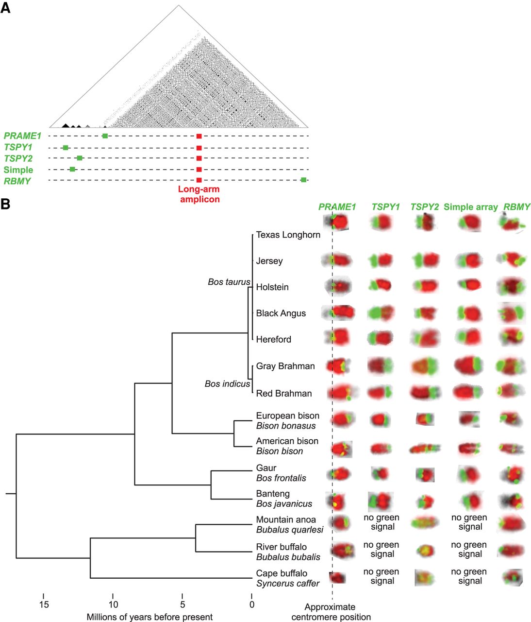 Conservation of major MSY repeats across bovine species. Two-color FISH analyses in five different Bos taurus breeds, two Bos indicus breeds, and seven wild bovine species. (A) Positions of CHORI-240 BAC FISH probes within sequenced bull MSY. Five different probe combinations were used. In all experiments, the red probe is the same BAC, derived from the long-arm amplicon. The green probe differs among experiments, as indicated. (B) Phylogenetic tree, drawn to scale, represents evolutionary relationships among bovine species. Representative Y Chromosomes observed in extended metaphase FISH images are shown for each experiment in each species. Red and green signals derive from colored FISH probes diagrammed in A.