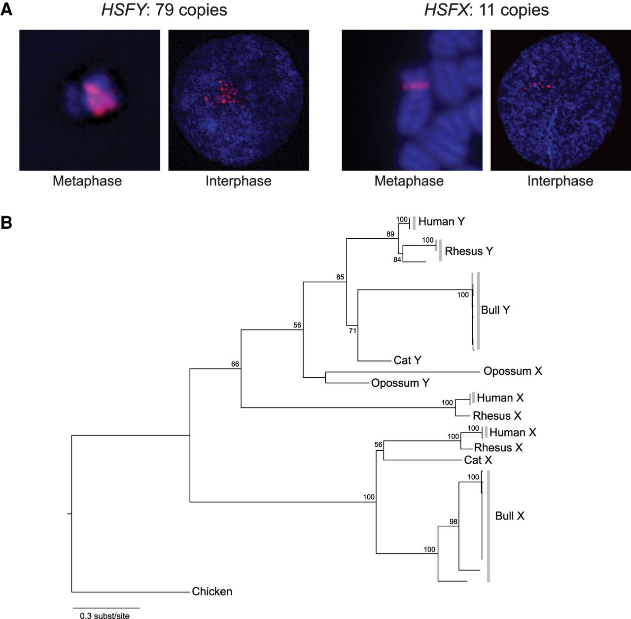 Coamplification of testis-specific gene families on X and Y Chromosomes. (A) Extended metaphase and interphase FISH analysis using CHORI-240 BAC probes containing HSFY (red, C0365D18) or HSFX (red, C0054K01). (B) Phylogenetic analysis of HSFY and HSFX amino acid sequences in mammals; chicken autosomal homolog was used as an outgroup. Branch lengths are proportional to substitution rates. Numbers at nodes indicate support from 100 bootstrap replicates. Gray bars highlight multicopy gene families within species. For bull, only 11 of 79 nearly identical HSFY copies for which we have sequence were included in alignment; all 11 copies of HSFX for which we have sequence were included.