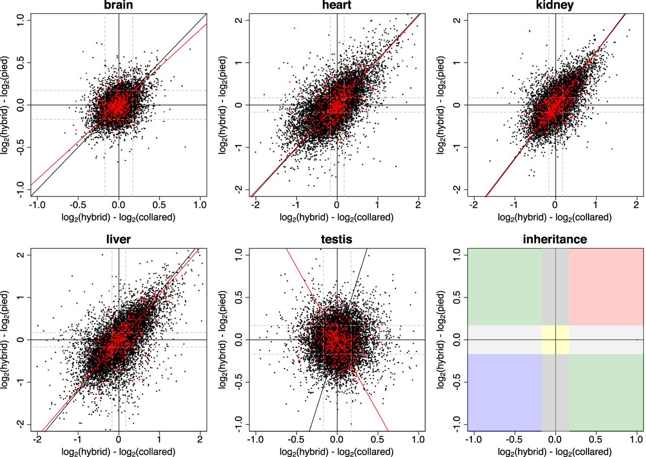 Inheritance mode of gene expression patterns in natural F1 hybrids of collared flycatcher and pied flycatcher in five tissues. The scatterplots show shrunken log2-fold changes between F1 hybrids and collared flycatcher on the x-axis, and between F1 hybrids and pied flycatcher on the y-axis. One dot represents the inheritance pattern of one gene. Autosomal genes are shown in black, genes located on the Z Chromosome are shown in red. The black and the red type II regression lines represent the major variation in log2-fold changes for autosomal and Z-linked genes, respectively. Vertical and horizontal black solid lines indicate the coordinate axes. Gray dashed lines indicate the fold-change threshold of 1.125, used for classification of inheritance patterns. Right, bottom panel: The color code illustrates the thresholds used for classification of genes, with conserved in yellow, pied-dominant inheritance in light gray, collared-dominant inheritance in dark gray, additive inheritance in green, overdominant inheritance in red, and underdominant inheritance in blue.