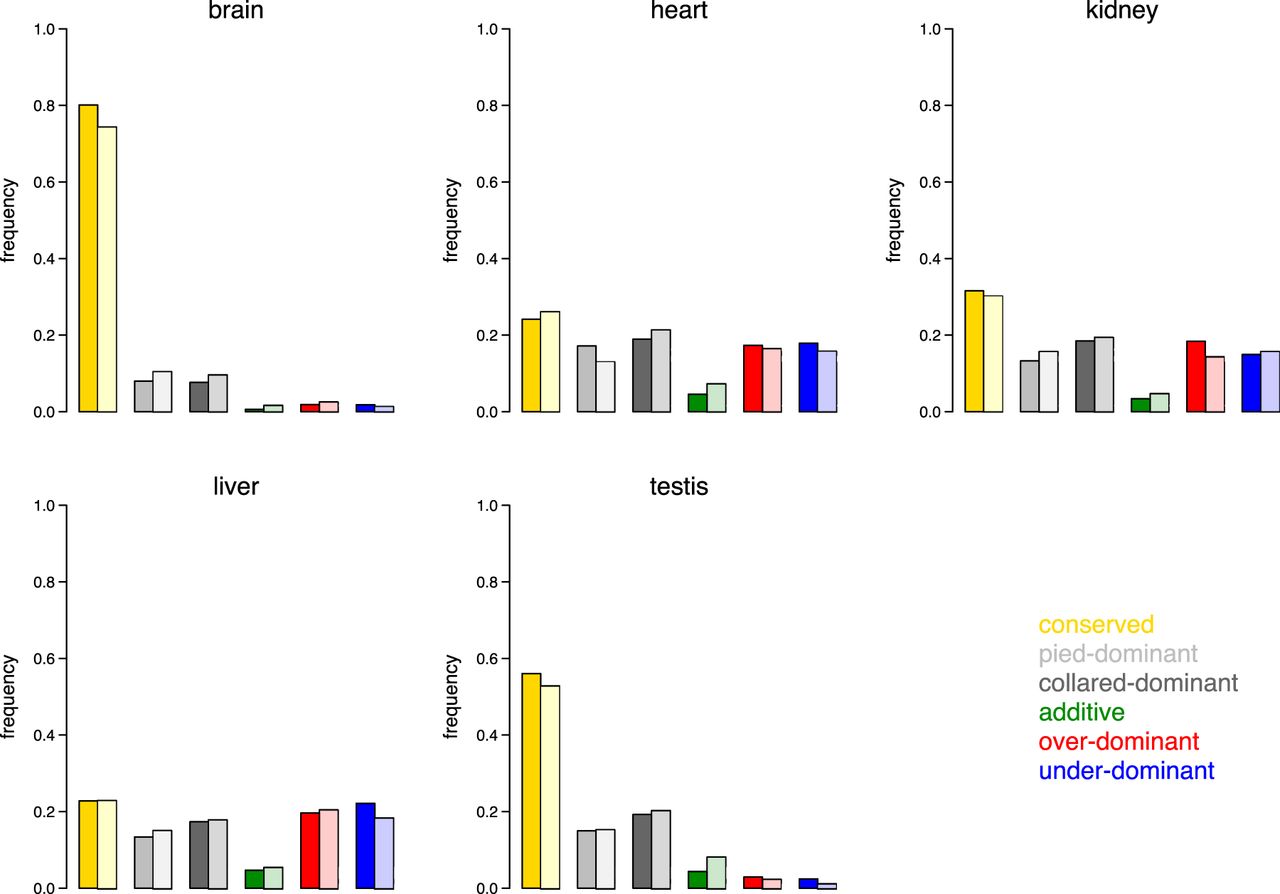 Inheritance mode of gene expression patterns across the five tissues, separately for genes located on autosomes (opaque colors) and the Z Chromosome (transparent colors). The height of the bars shows the frequency of genes in each of the categories.